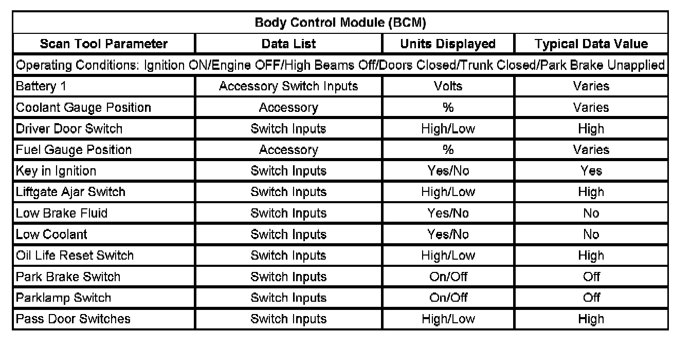 Scan Tool Data List - Body Control Module (BCM)