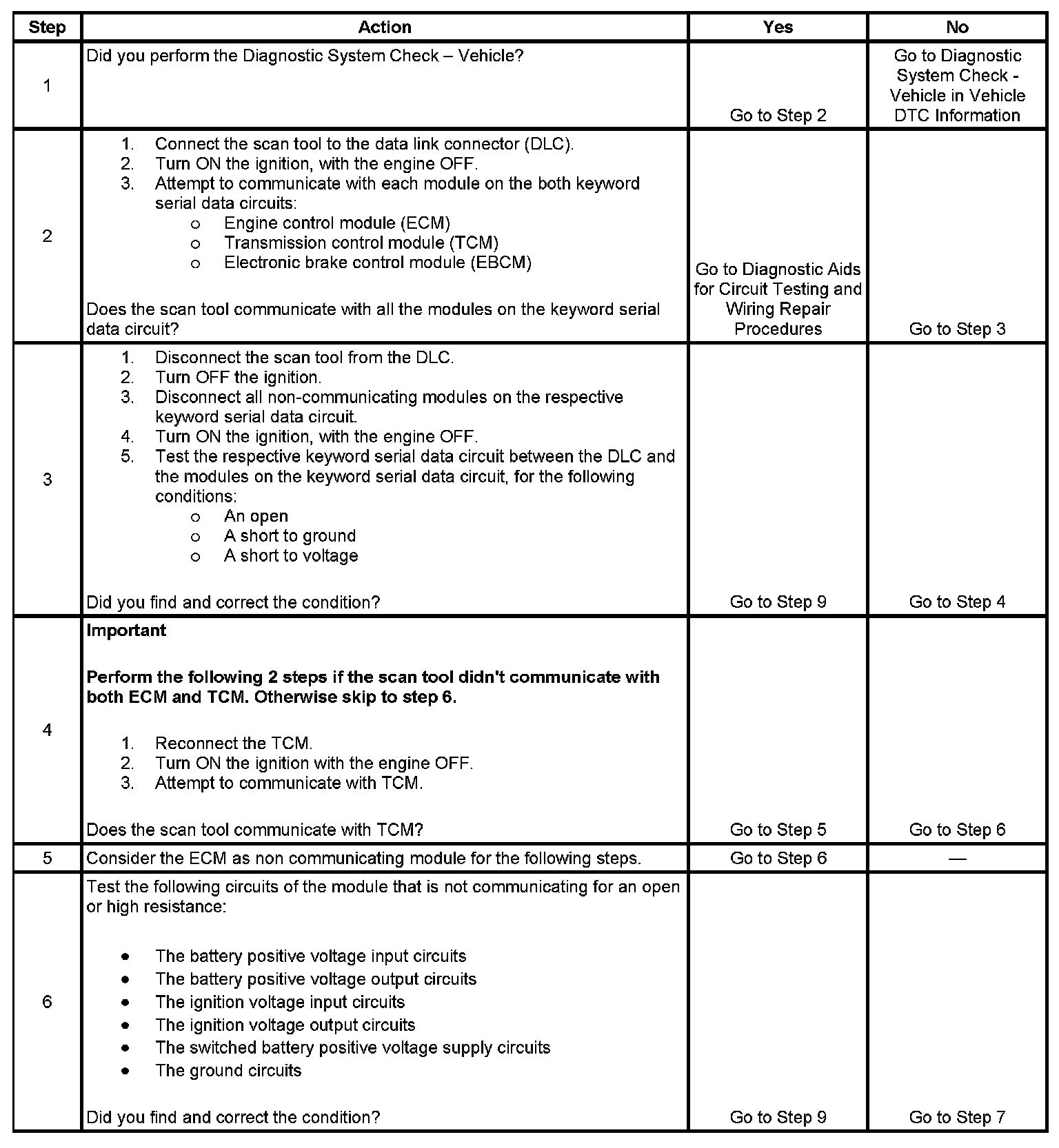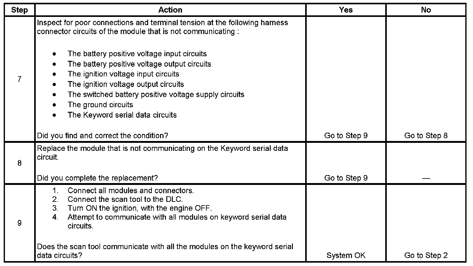 The Keyword protocol utilizes a single wire bi-directional data line between the modules and the scan tool. The message structure is a request and response arrangement. Keyword serial data is used for scan tool diagnostics only. The modules do not exchange data on this circuit. There are two independent Keyword serial data circuits connected to data link connector (DLC) terminals 7 and 12.