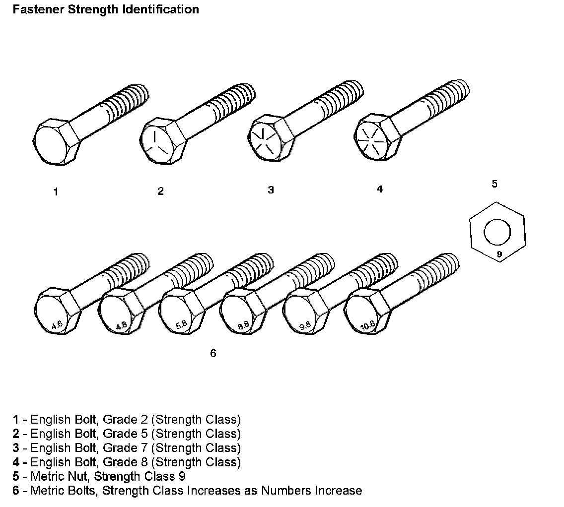 The most commonly used metric fastener strength property classes are 9.8 and 10.9. The class identification is embossed on the head of each bolt. The English, inch strength classes range from grade 2 to grade 8. Radial lines are embossed on the head of each bolt in order to identify the strength class. The number of lines on the head of the bolt is 2 lines less than the actual grade. For example, a grade 8 bolt will have 6 radial lines on the bolt head. Some metric nuts are marked with a single digit strength identification number on the nut face.