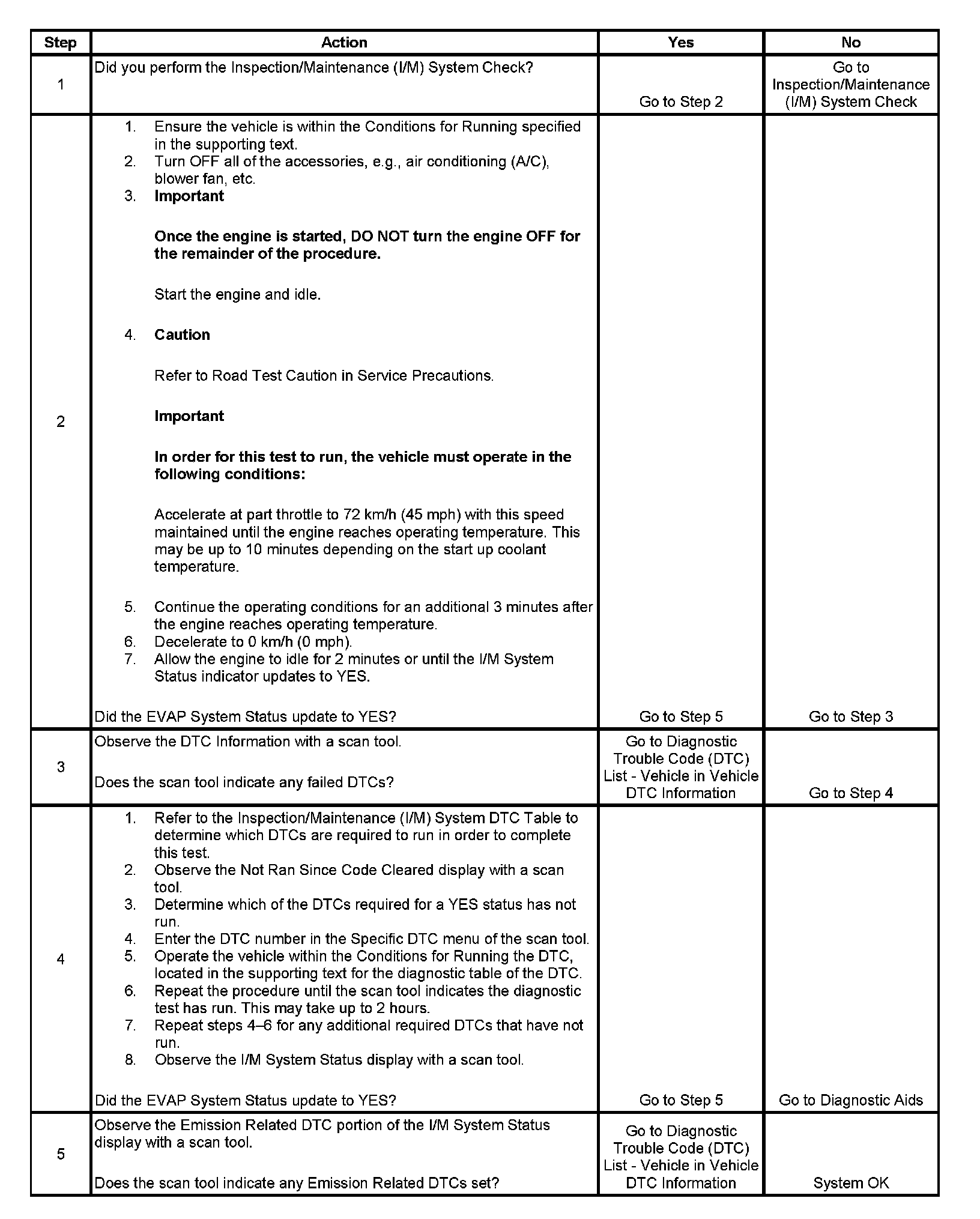 The purpose of this test is to satisfy the enable criteria necessary to execute inspection/maintenance (I/M) readiness diagnostics for the evaporative emission (EVAP) system. The test may be used to set the I/M System Status indicators to YES. The I/M System Status Display on the scan tool provides an indication of whether the control module has completed the required tests. The I/M System Status does not indicate that the tests have passed or failed. When all of the diagnostics for a specific system have run and passed the I/M System Status will update to YES. If a test for a specific system has failed, the I/M System Status will update to YES, indicating a determination was made, even if all of the other tests for that system have not run. Performing a visual inspection prior to running the EVAP test may prevent having to repeat the test. A failed or aborted test will require the vehicle to cool down in order to meet the enable criteria to run another test.