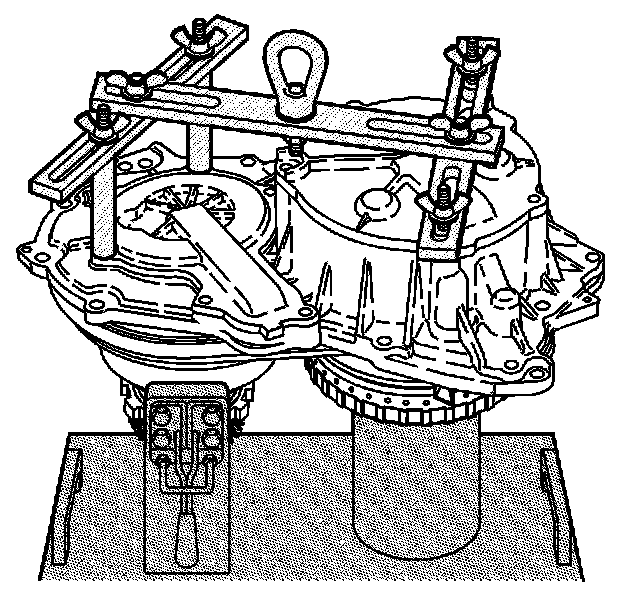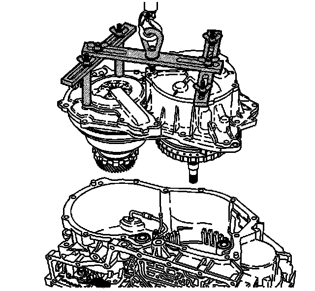 Using a suitable lifting device, carefully lift the case cover assembly - with forward clutch and input shaft - out of the J 44337 and lower into the transmission case assembly.