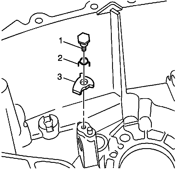 5. Install the reverse lockout lever (3), spring (2), and the bolt (1) to the transmission housing, if equipped.