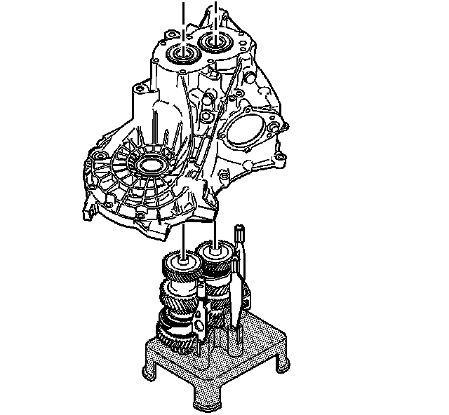 16. Install the input shaft and output shaft bearings into the transmission housing using the J 44385 (2) and the J 7079-2 (1).