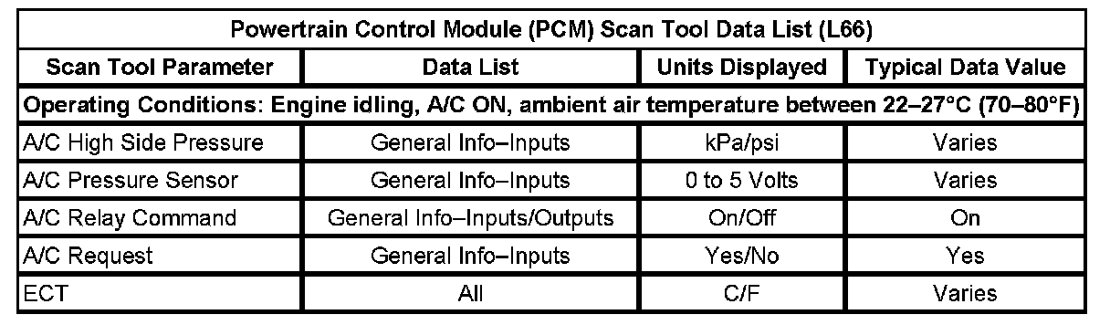 Powertrain Control Module (PCM) Scan Tool Data List: