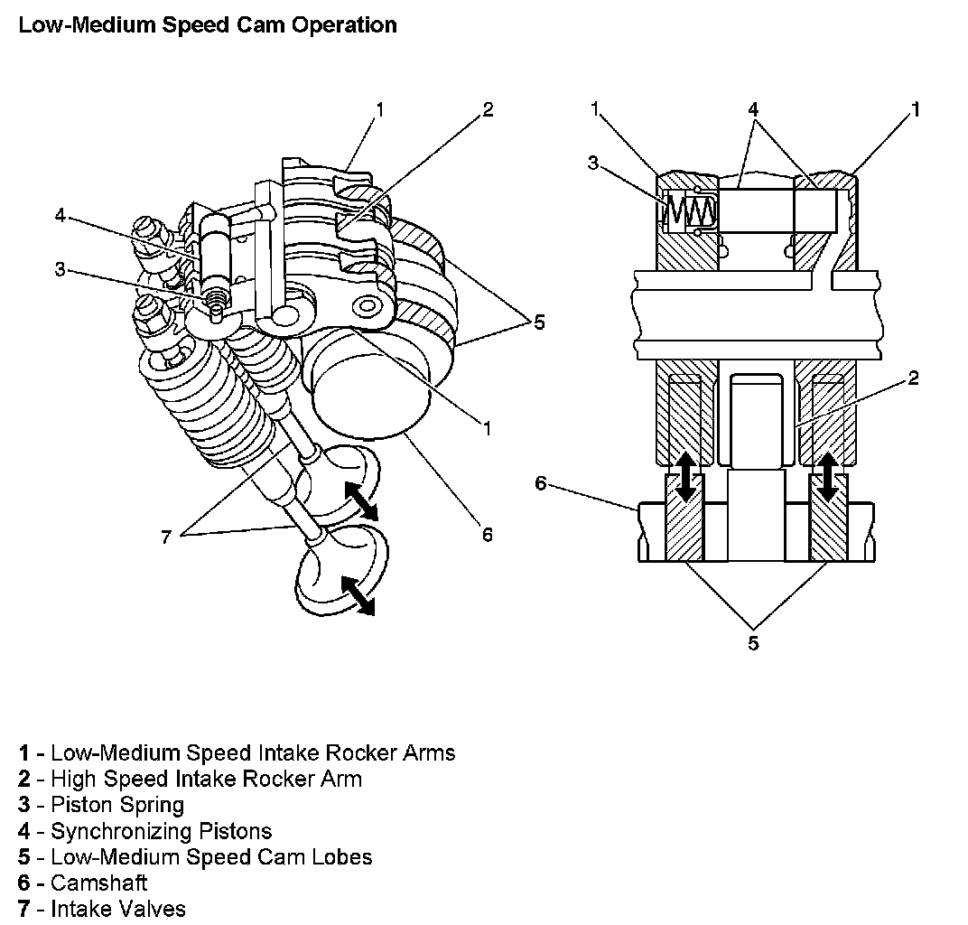At engine speeds below 4,400 RPM, the low-medium speed cam lobes (5) open and close the intake valves (7) thru the low-medium speed rocker arms (1). During low-medium speed operation, the rocker arm oil control solenoid is OFF and there is no oil flow to the rocker arms. Without oil flow there is no oil pressure, and the piston spring (3) keeps the synchronizing pistons (4) at rest in their bores within the three rocker arms (1 and 2). This allows the high speed rocker arm (2) to move independently of the two low-medium speed rocker arms (1) while following the high speed cam lobe.