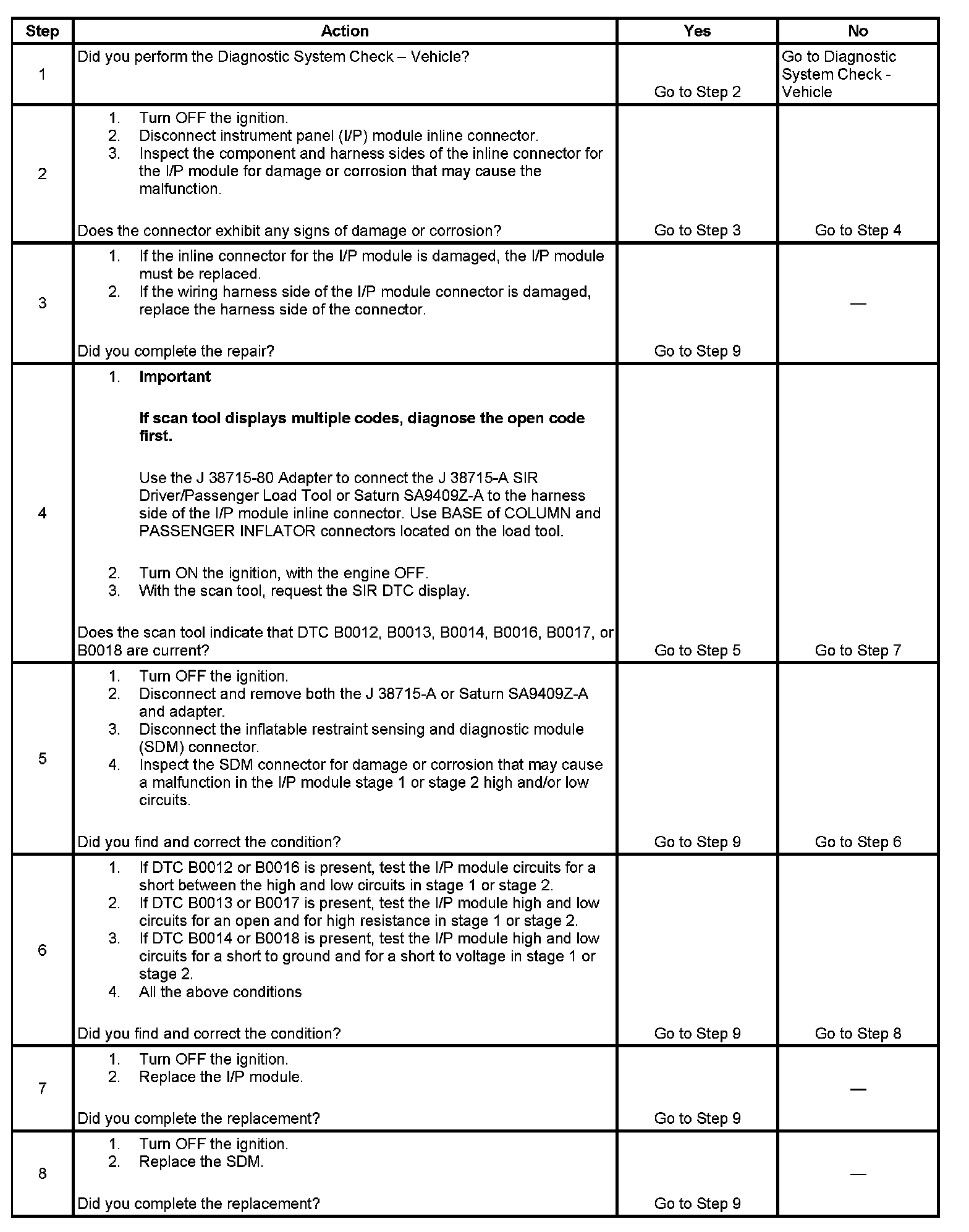 - DTC B0012 stage 2 or B0016 stage 1 will set when the I/P module deployment loop resistance is less than 1.3 ohms for 500 milliseconds.