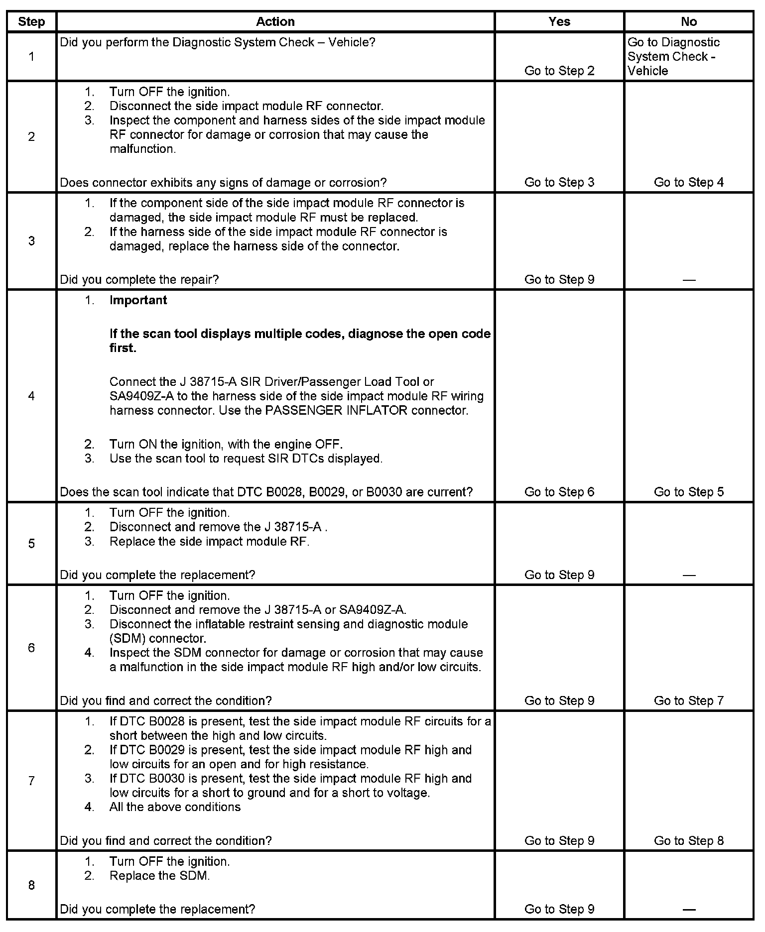 7. This step tests to see what DTCs are present. If DTC B0028 is present, test the side impact module RF for a short between high and low circuits. If DTC B0029 is present, test the side impact module RF high and low circuits for an open and for high resistance. If DTC B0030 is present, test the side impact module RF high and low circuits for a short to ground or a short to voltage.