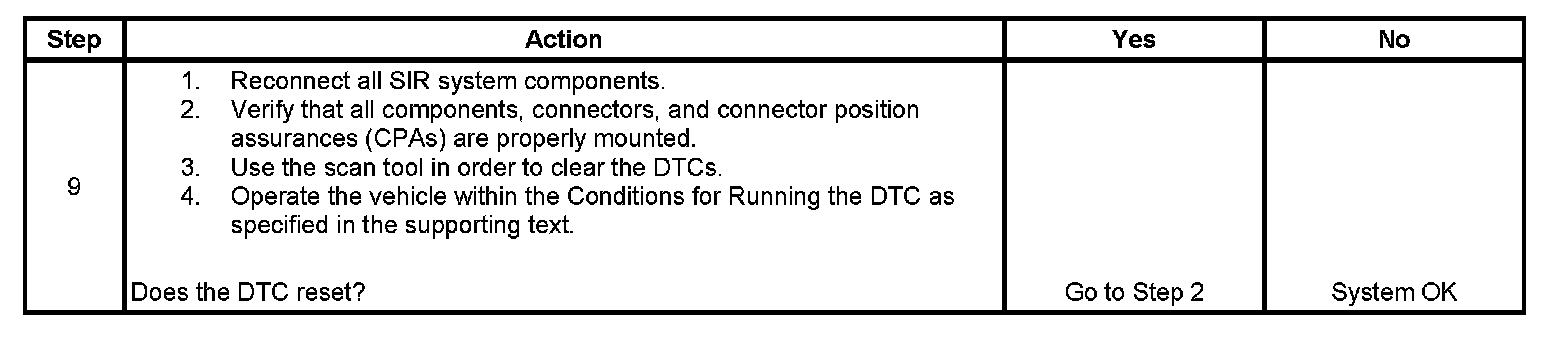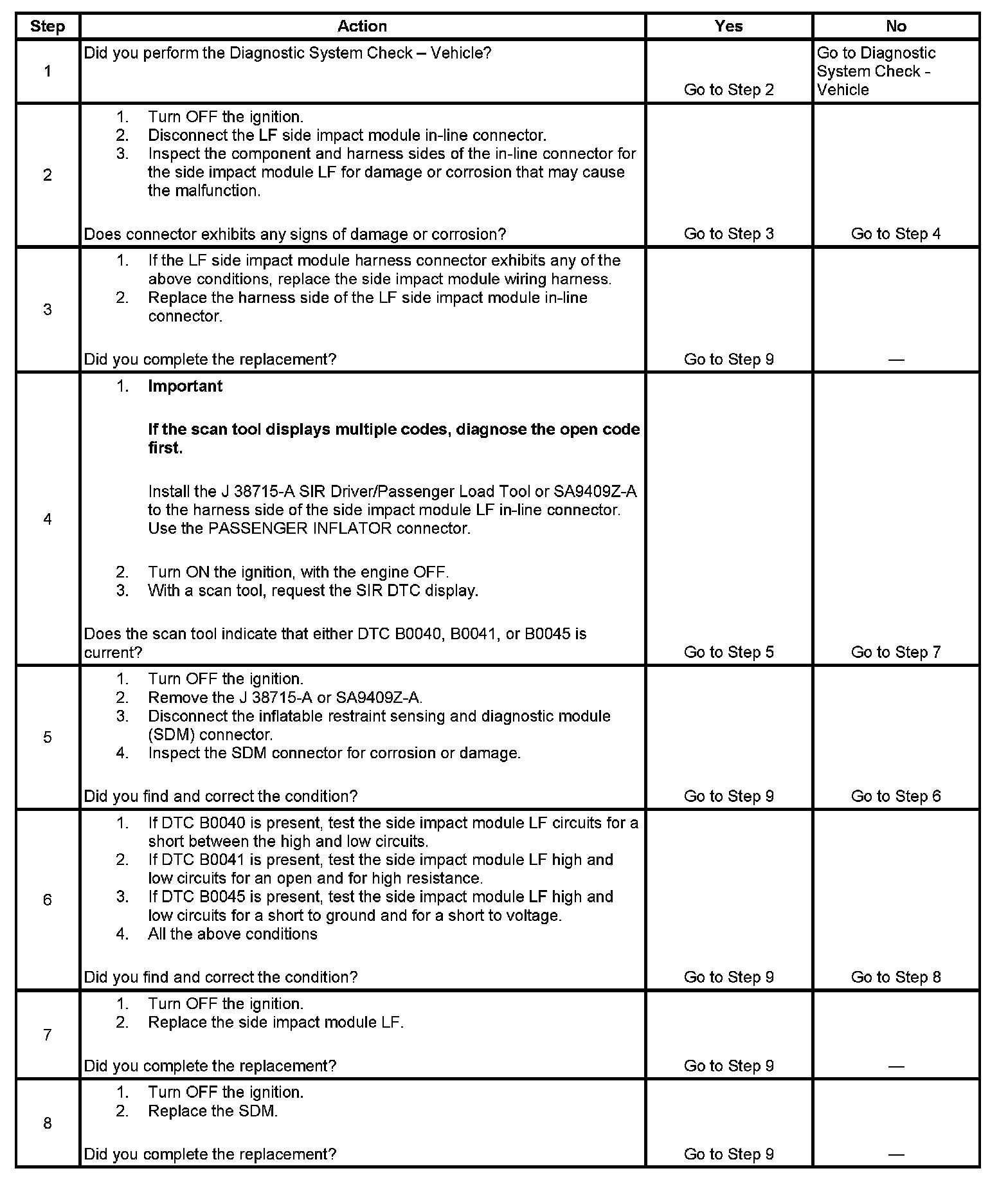 6. This step tests to see what DTCs are present. If DTC B0040 is present, test the side impact module LF for a short between high and low circuits. If DTC B0041 is present, test the side impact module LF high and low circuits for an open and for high resistance. If DTC B0045 is present, test the side impact module LF high and low circuits for a short to ground or a short to voltage.