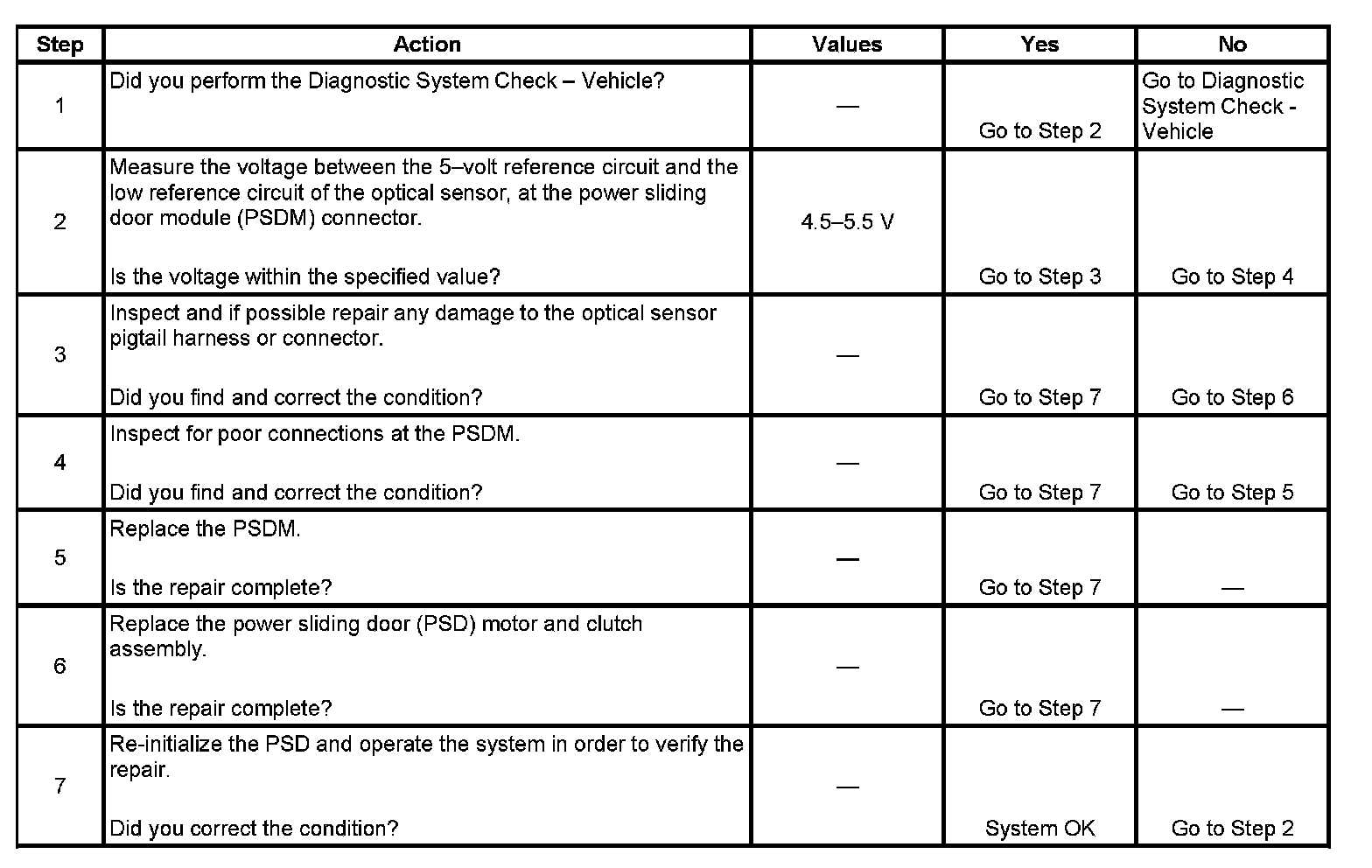 The power sliding door control module (PSDM) uses an optical sensor to monitor the power sliding door (PSD) position at all times. The optical sensor requires a 5-volt reference circuit and a reference return circuit, as well as a signal 1 and a signal 2 circuit. The output of the 5-volt reference circuit is normally between 4.5-5.5 volts.