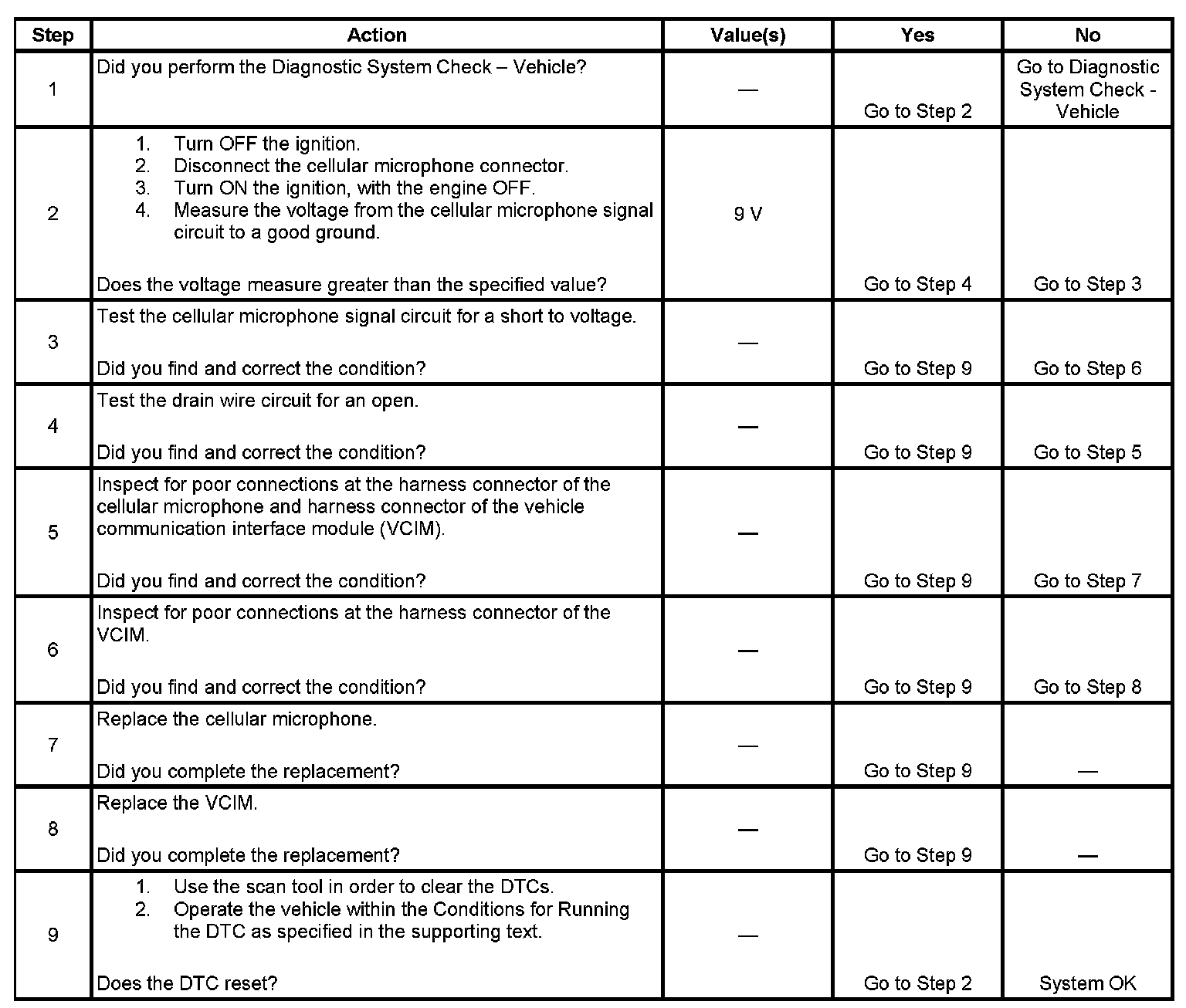 - The VCIM detects an open in the cellular microphone low reference circuit or a short to voltage in the cellular microphone signal circuit.