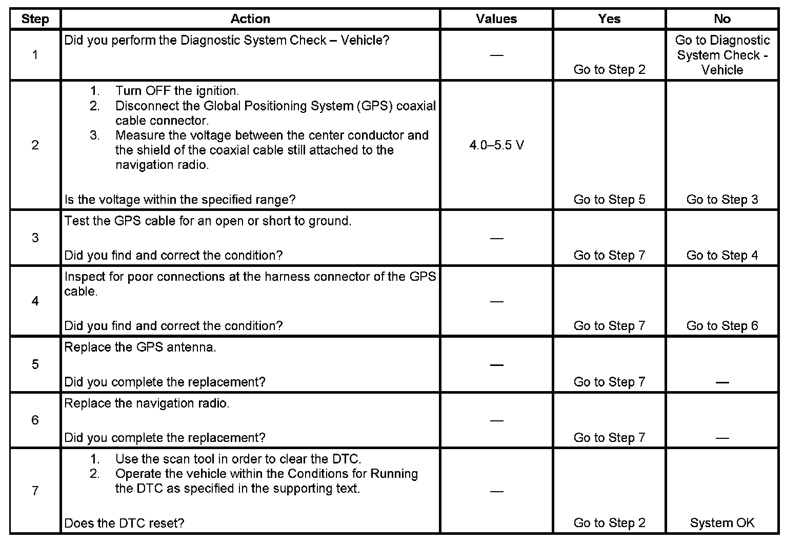 The numbers below refer to the step numbers on the diagnostic table.