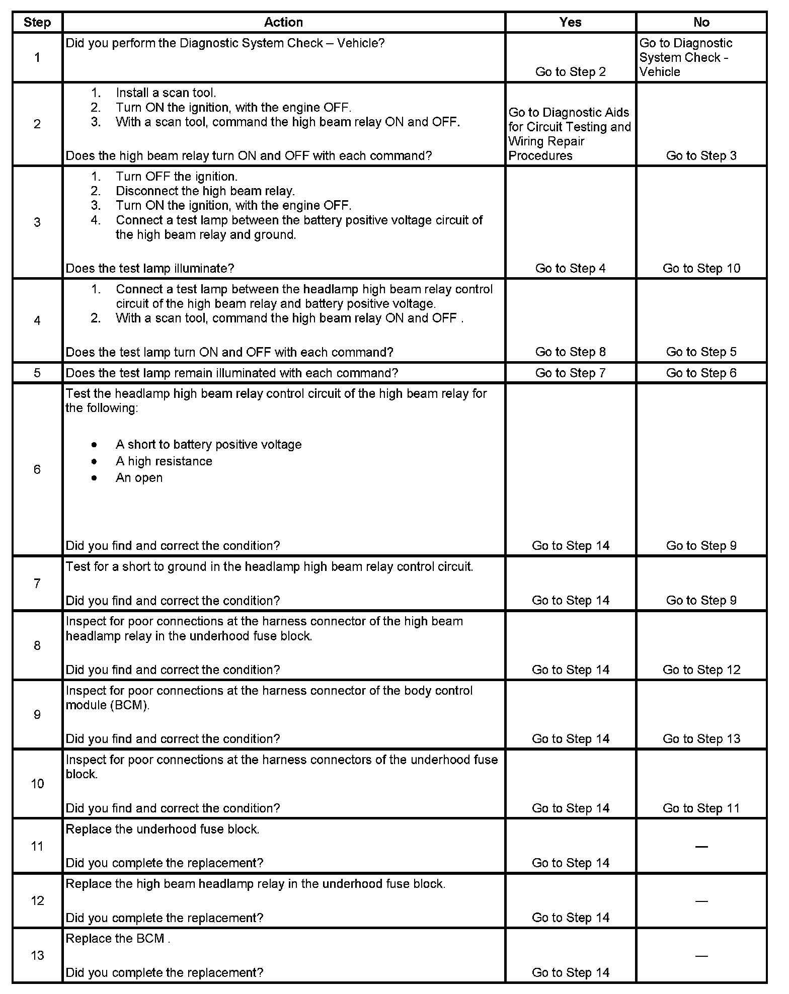 - When the BCM does not activate the high beam relay and the headlamp high beam relay control circuit is shorted to ground