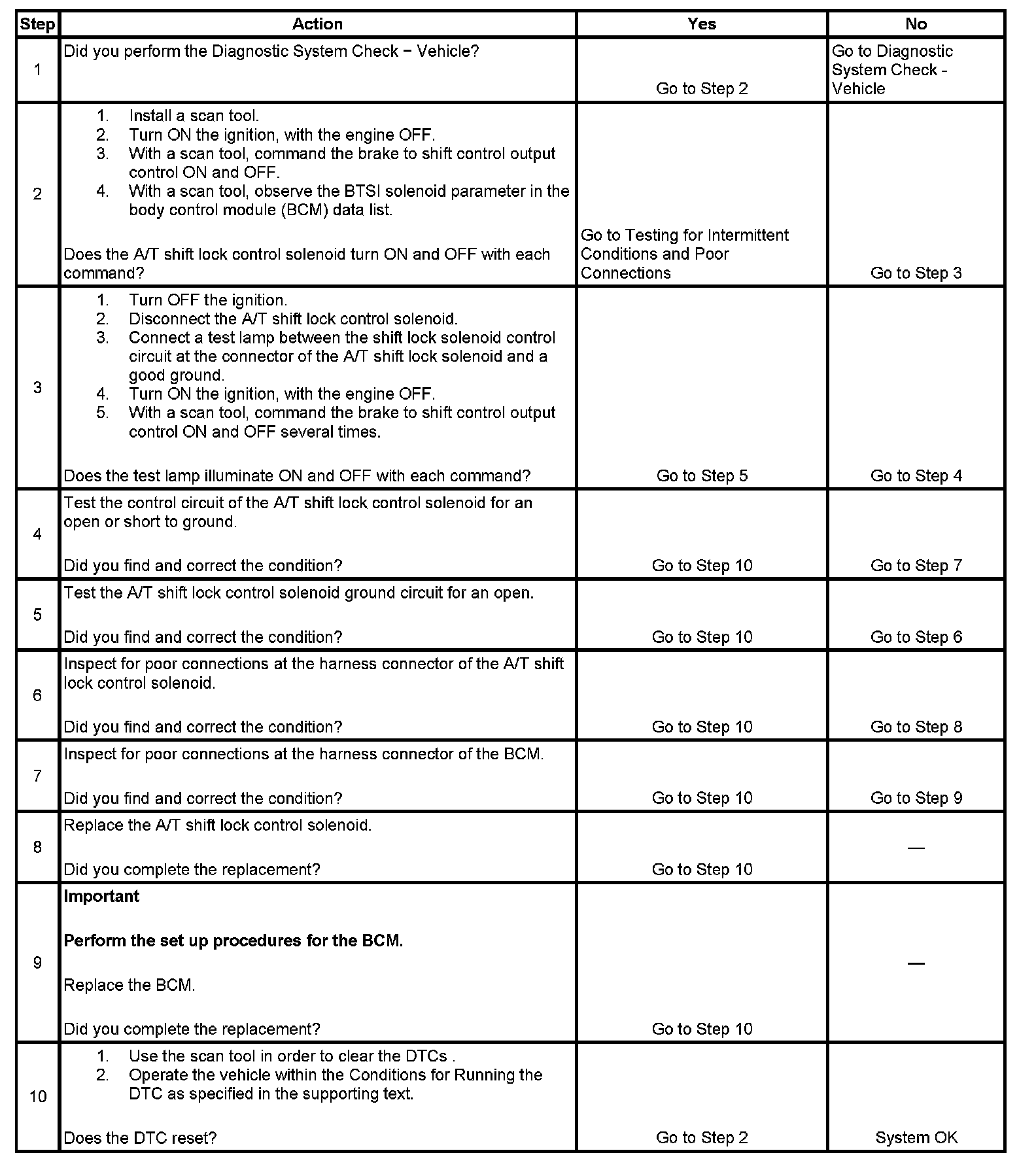 4. This step tests for an open or short to ground at the control circuit of the A/T shift lock control solenoid.