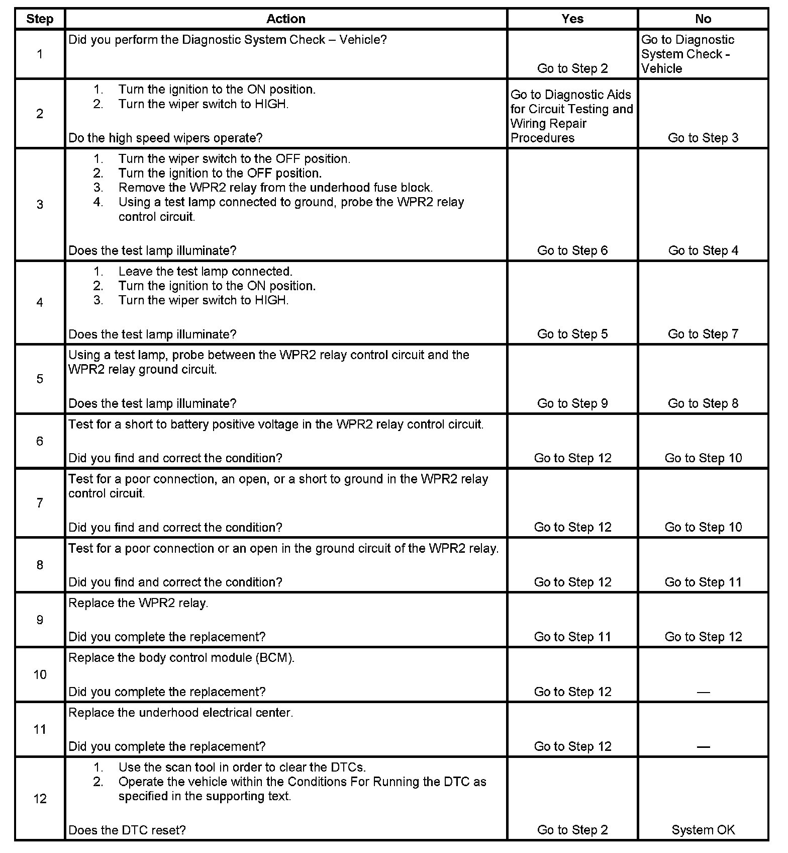 The body control module (BCM) controls and monitors the state of the WPR2 relay control circuit. When the windshield wiper switch is placed in to a high speed setting, a signal is applied to the BCM through the windshield wiper switch high signal circuit. The BCM then applies battery positive voltage to the WPR2 relay through the WPR2 relay control circuit. This energizes the WPR2 relay, allowing battery positive voltage to be applies from the FRT WPR fuse, through the switched contacts of the WPR1 relay and through the switched contracts of the WPR2 relay to the windshield wiper motor. Ground is applied at all times to the coil side of the WPR2 relay and to the windshield wiper motor from G200.