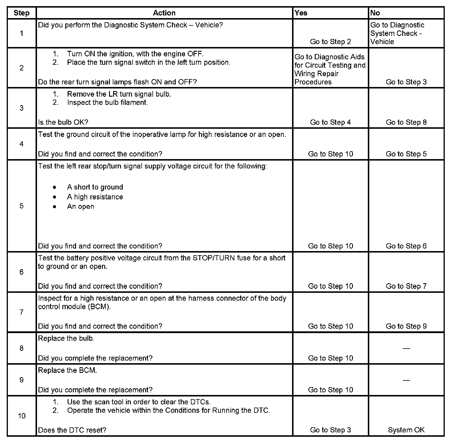 When the turn signal switch is placed in the left turn position, the body control module (BCM) cycles positive voltage ON and OFF to the LR turn signal lamps through the left rear stop/turn lamp supply voltage circuit.