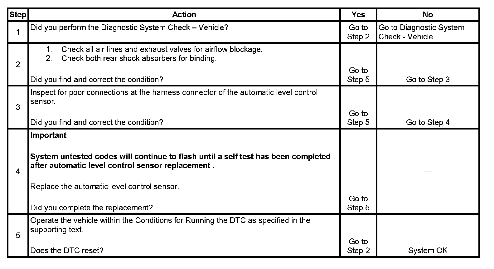 This DTC is set when the automatic level control sensor detects the exhaust valve has been on for 255 seconds and the automatic level control sensor did not detect the calibrated downward movement.