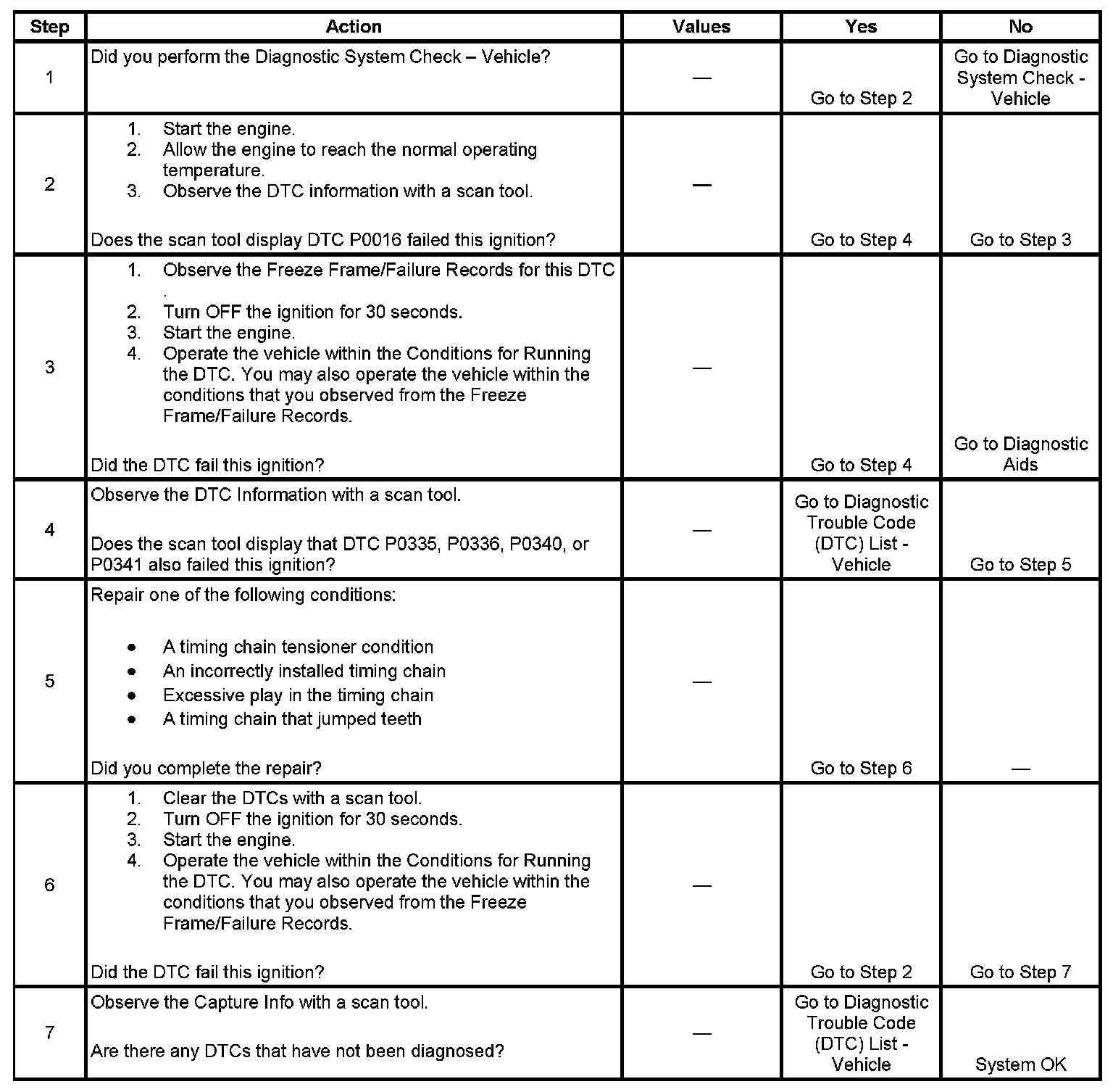 The powertrain control module (PCM) uses the crankshaft position (CKP) sensor and the camshaft position (CMP) sensor signals to monitor the correlation between the crankshaft and camshaft positions. If the PCM detects that the timing between the crankshaft and the camshaft is incorrect, DTC P0016 sets.