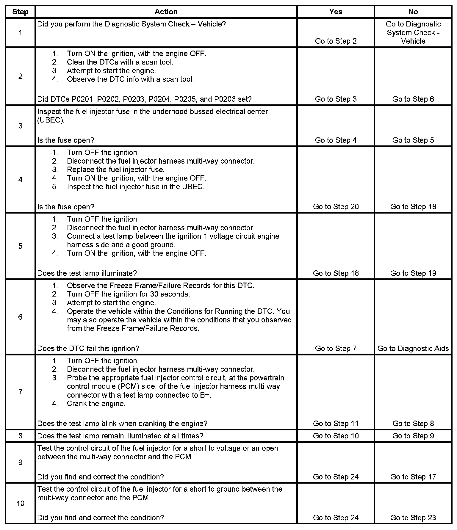 The powertrain control module (PCM) enables the appropriate fuel injector for each cylinder. A voltage is supplied directly to the fuel injectors. The PCM controls each fuel injector by grounding the control circuit via a solid state device called a driver. The PCM monitors the status of each driver. If the PCM detects an incorrect voltage for the commanded state of the driver, a fuel injector control DTC P0201-P0206 sets.