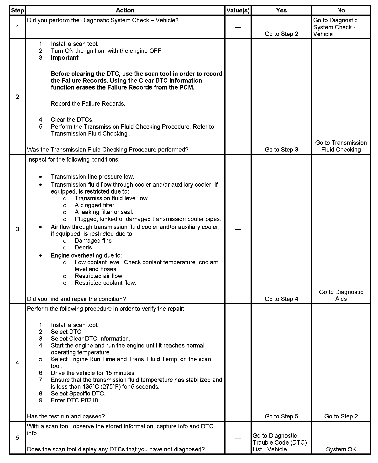 When the powertrain control module (PCM) detects high transmission fluid temperature for an extended period of time, then DTC P0218 sets. DTC P0218 is a type C DTC.