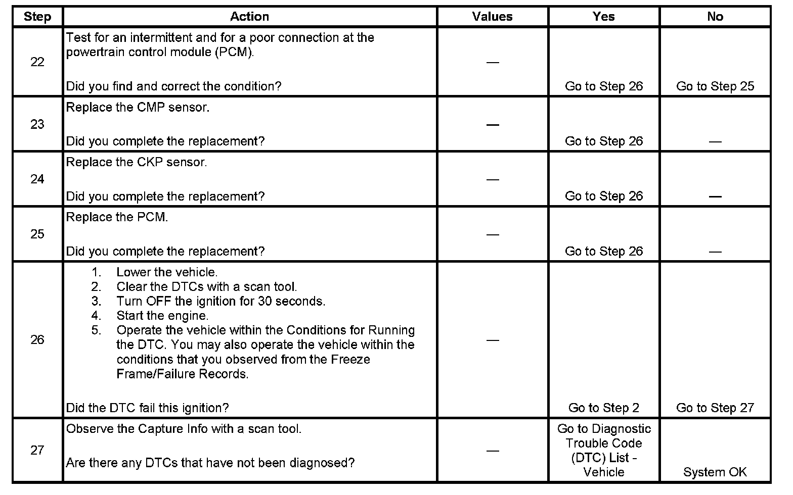 The numbers below refer to the step numbers on the diagnostic table.