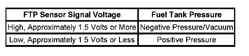 The table illustrates the relationship between the FTP sensor signal voltage and the EVAP system pressure/vacuum.