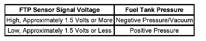 The table illustrates the relationship between FTP sensor signal voltage and the EVAP system pressure/vacuum.