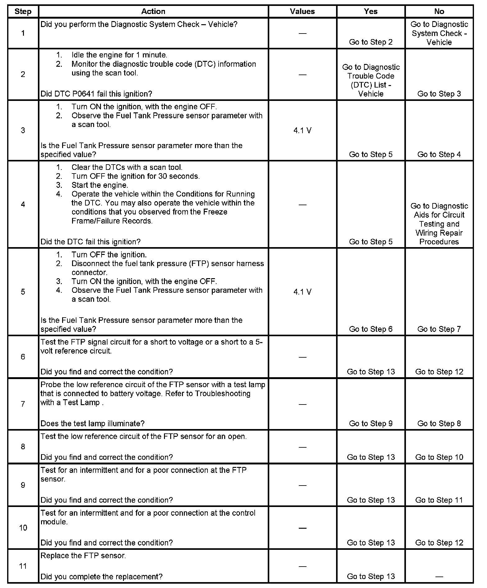 The fuel tank pressure (FTP) sensor measures the difference between the air pressure or vacuum in the evaporative emission (EVAP) system, and the outside air pressure. The control module supplies a 5-volt reference and a low reference circuit to the FTP sensor. The FTP sensor signal circuit voltage varies depending on EVAP system pressure or vacuum. If the FTP sensor signal voltage increases above a calibrated value, this DTC sets.