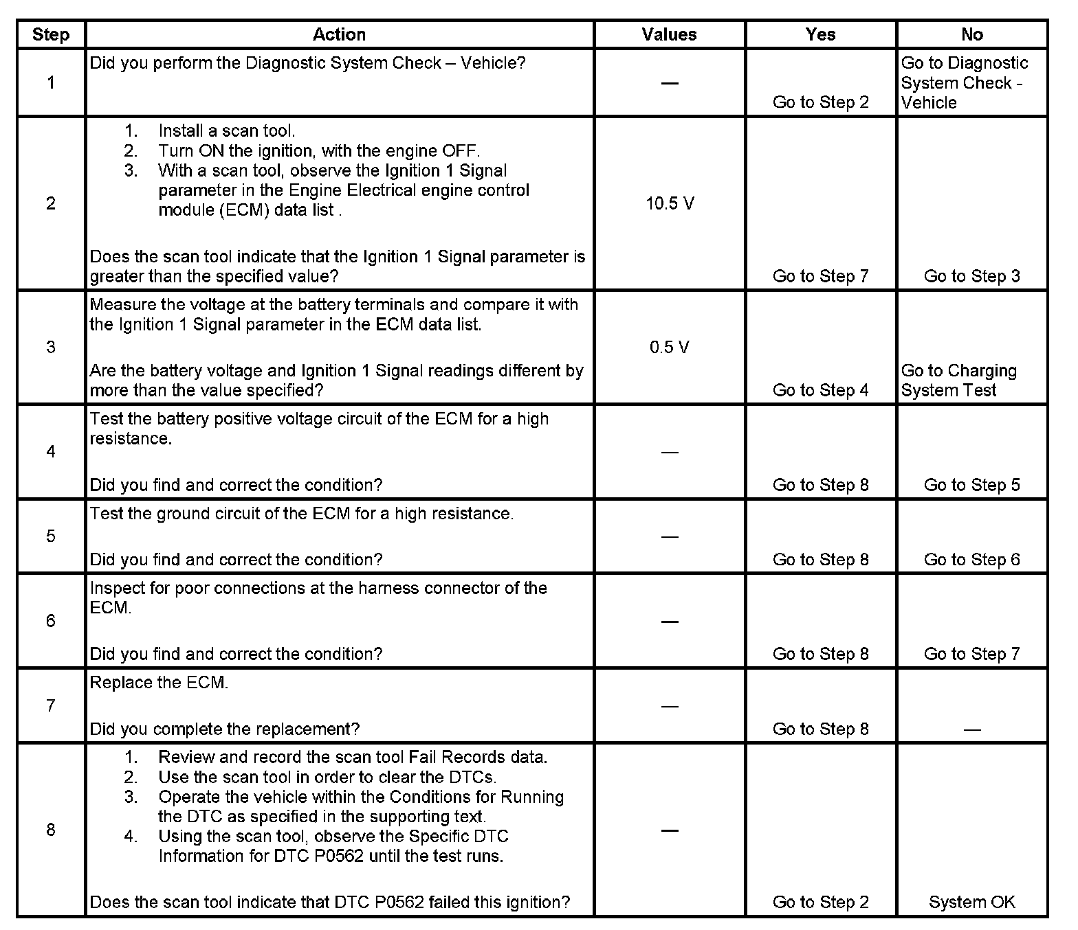 The engine control module (ECM) monitors the system voltage to ensure that the voltage stays within the proper range. Damage to components, and incorrect input can occur when the voltage is out of range. The ECM monitors the system voltage over an extended length of time. If the ECM detects an excessively low system voltage, DTC P0562 will set.