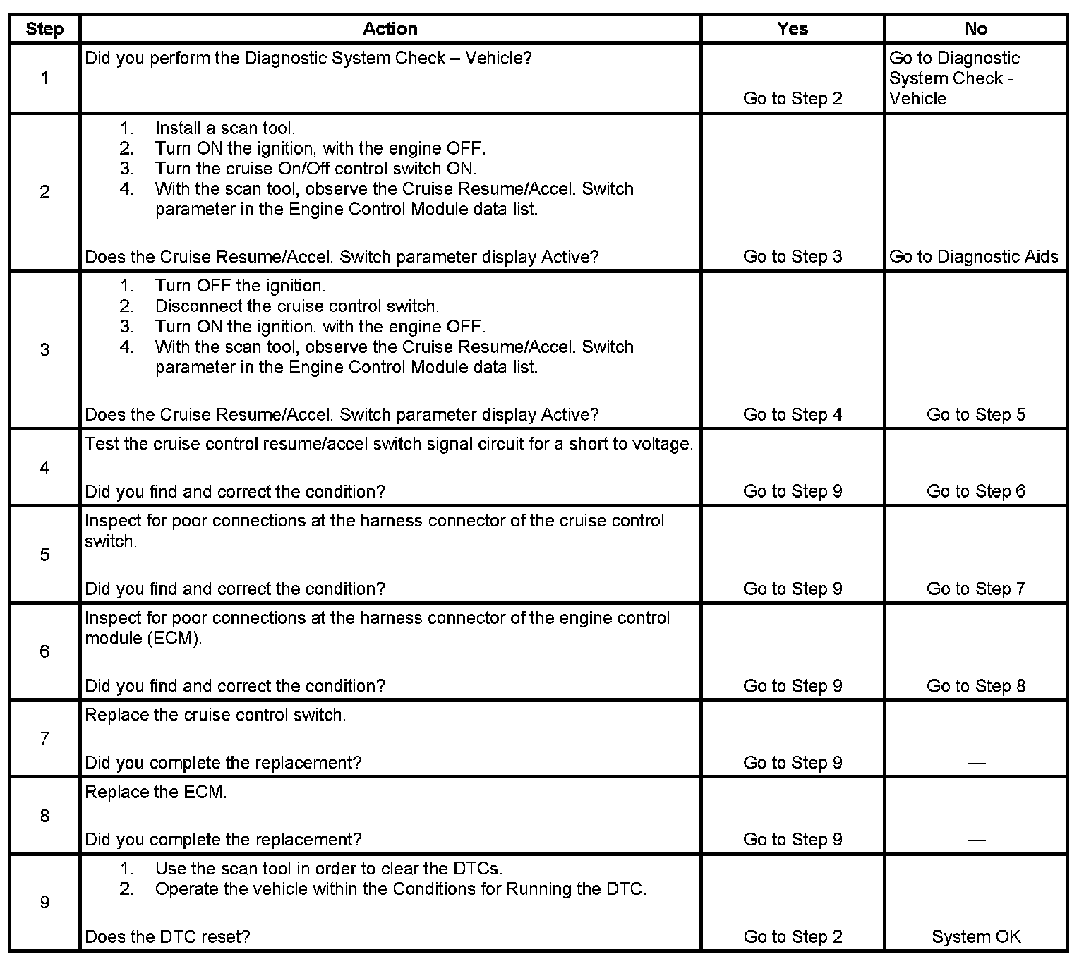 The cruise control resume/accel switch is an input to the engine control module (ECM). The ECM monitors the cruise control resume/accel switch signal circuit in order to detect when the driver has requested to accelerate the set vehicle speed or to resume the cruise control system. The ECM module detects a voltage signal on the cruise control resume/accel switch signal circuit when the switch is applied. This DTC sets if the ECM detects that voltage is present on the cruise control resume/accel switch signal circuit for longer than 90 seconds.