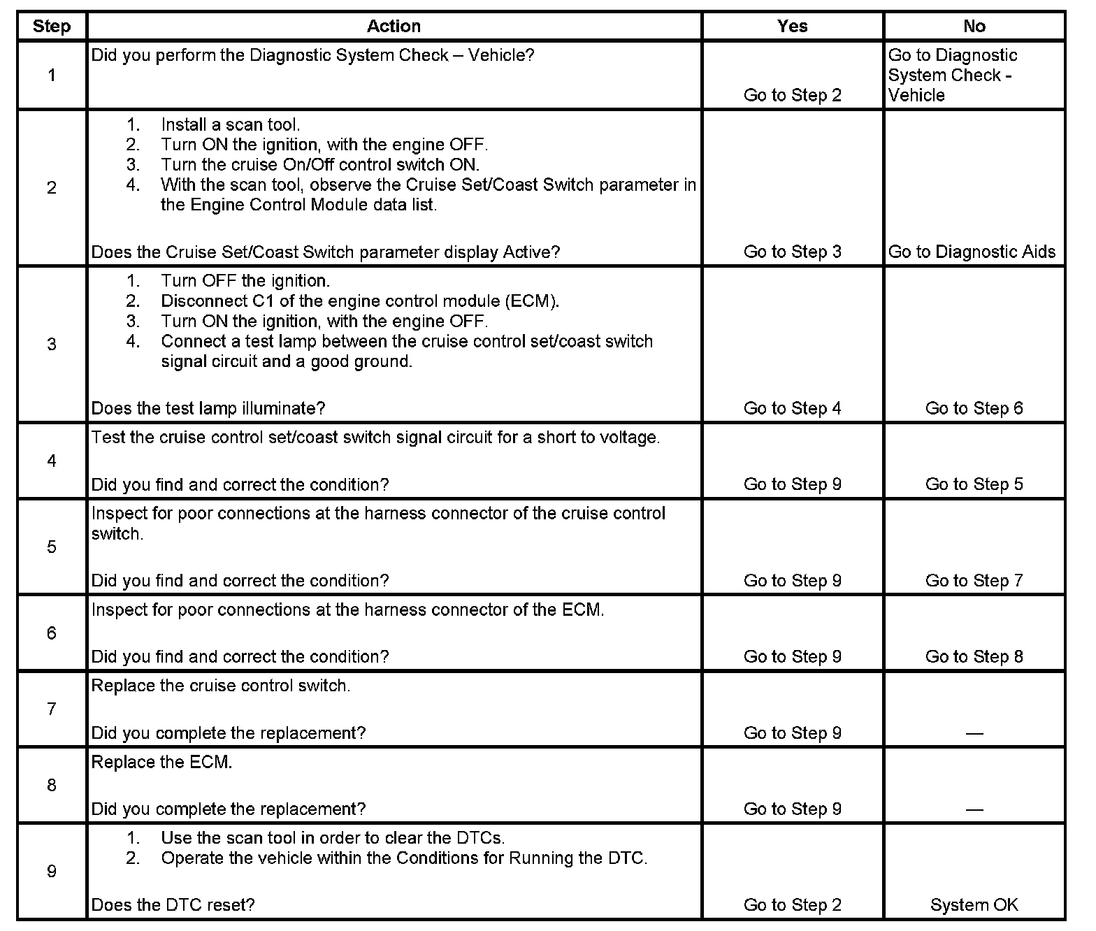 - Inspect for a set/coast switch stuck in the engaged position or the signal circuit is shorted to voltage.