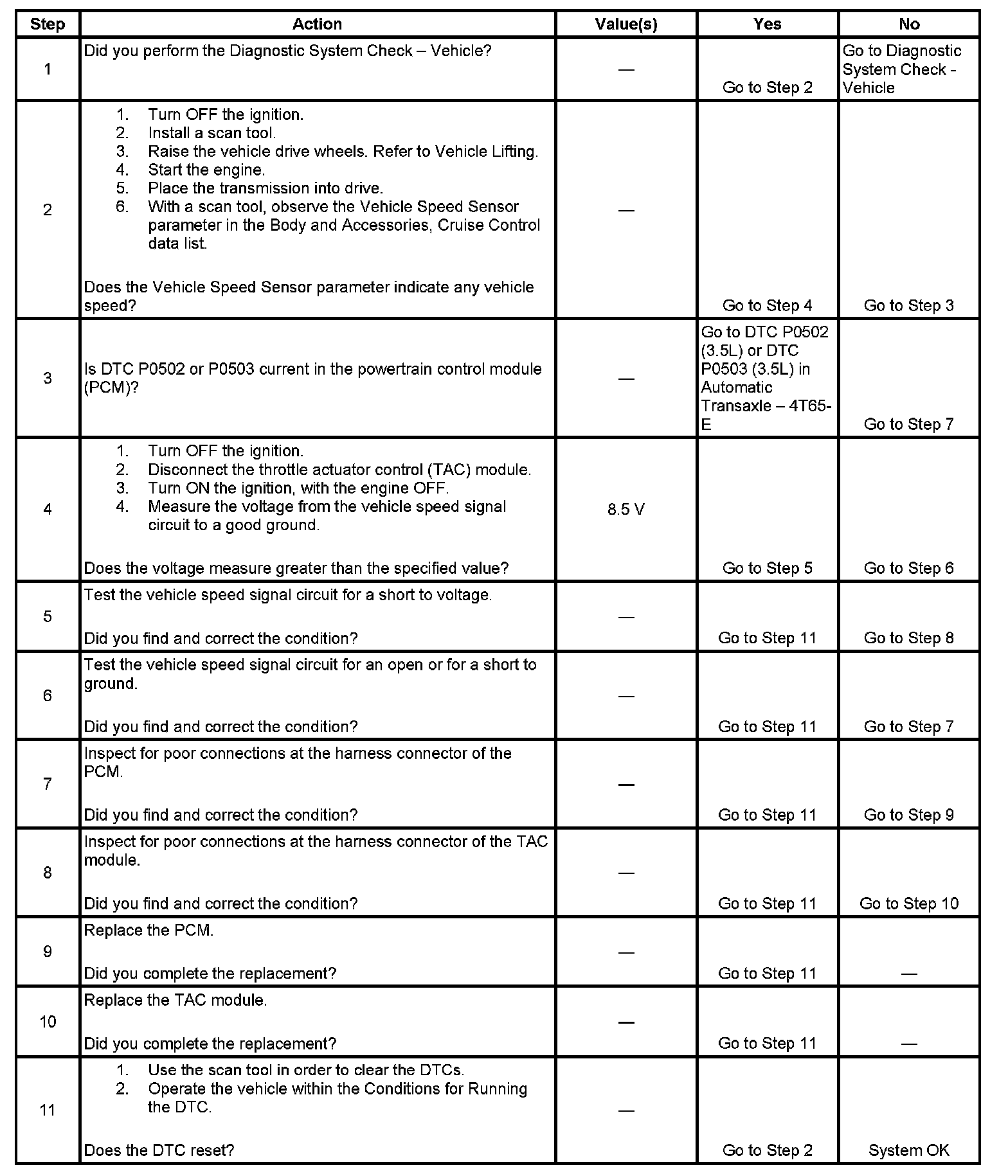 The vehicle speed signal circuit is an input to the throttle actuator control (TAC) module from the powertrain control module (PCM). The PCM provides a constant voltage signal on the vehicle speed signal circuit. The PCM creates the vehicle speed signal by internally pulsing the vehicle speed signal to ground. The TAC module uses the vehicle speed signal from the PCM, in order to determine the vehicle speed. The TAC module then sends a universal asynchronous receiver transmitter (UART) serial data message to the PCM indicating the vehicle speed that the TAC module has detected.