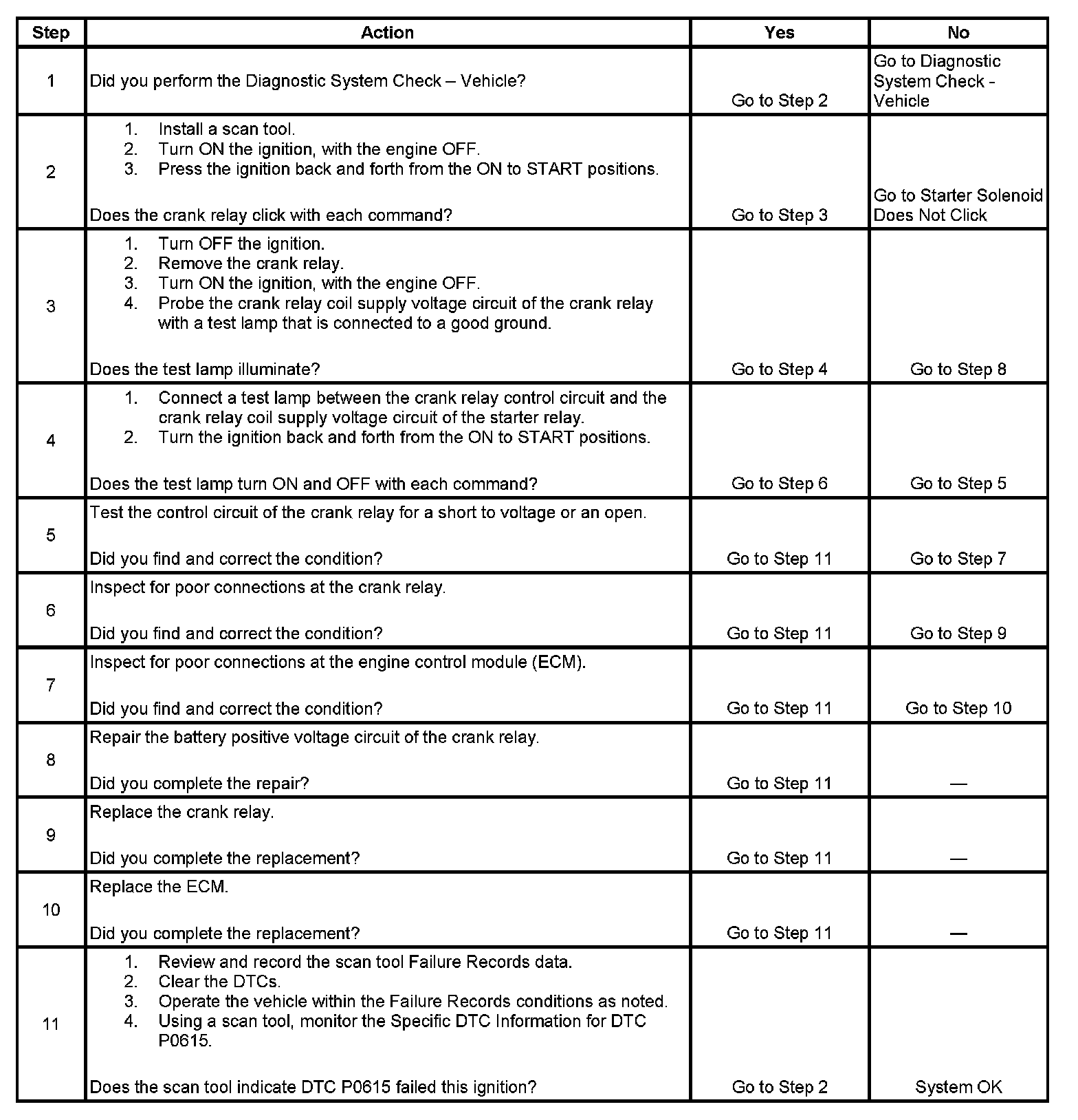 The engine control module (ECM) supplies a ground path for the crank relay when start enable has been requested. The ECM monitors this circuit for conditions that are incorrect for the commanded state. If the ECM detects an improper circuit condition, crank relay DTC P0615 will set.
