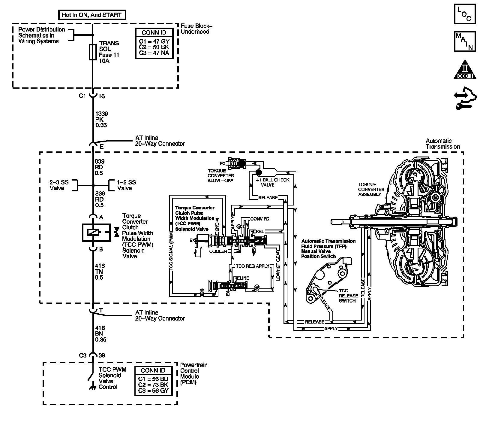 The PCM controls the torque converter clutch pulse width modulation (TCC PWM) solenoid valve. The solenoid controls the hydraulic fluid for TCC apply and release. When the TCC is fully applied, the engine is coupled directly to the transmission through the TCC.