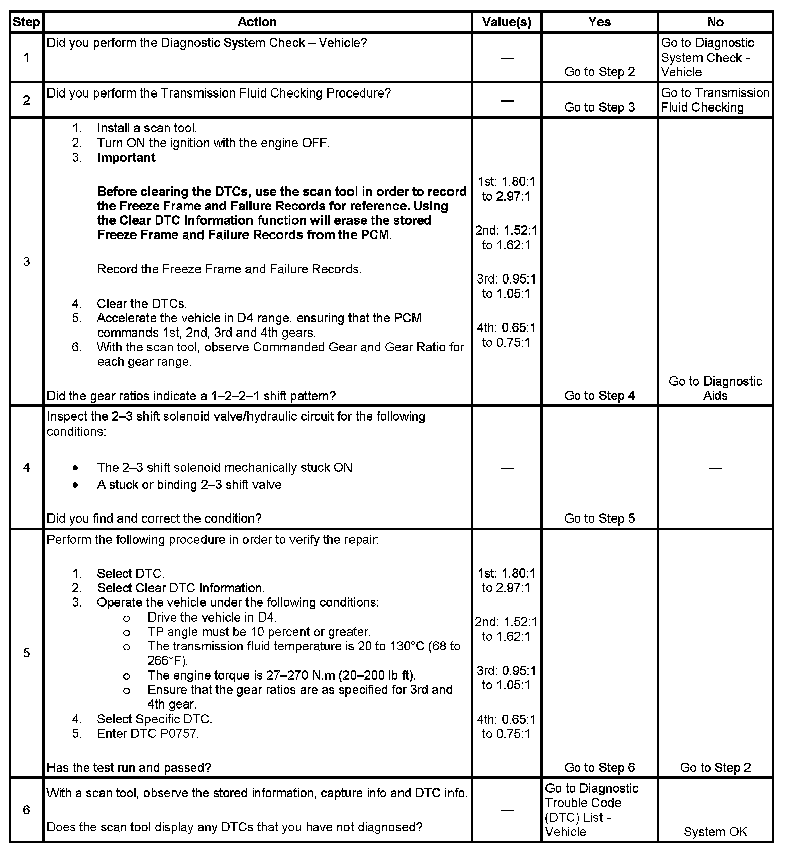 If the PCM detects a 2nd gear ratio when 3rd gear is commanded and a 1st gear ratio when 4th gear is commanded, then DTC P0757 sets. DTC P0757 is a type A DTC.
