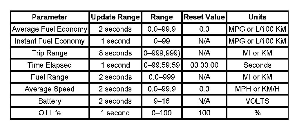 The compass displays an 8 point compass heading in the driver information center (DIC). The compass will display the current vehicle direction relative to one of 8 compass headings using N, NE, E, SE, S, SW, W, and NW for the readout. The ambient temperature displays in the DIC. The temperature display is updated every second and the temperature will not change from its initial temperature until the vehicle has been driven at 15 mph. If the ambient temperature is below 3°C (37°F), the temperature reading will toggle between displaying the outside temperature and the word ICE for two minutes. If the temperature is less than minus 40°F for more than 2 seconds, OC will display. If the temperature is above 140°F for more than 2 seconds, SC will be displayed. If OC or SC is displayed DTCs will be set. For compass calibration and compass magnetic variation adjustment refer to Electronic Compass Calibration. The temperature display updates once every 2 seconds.