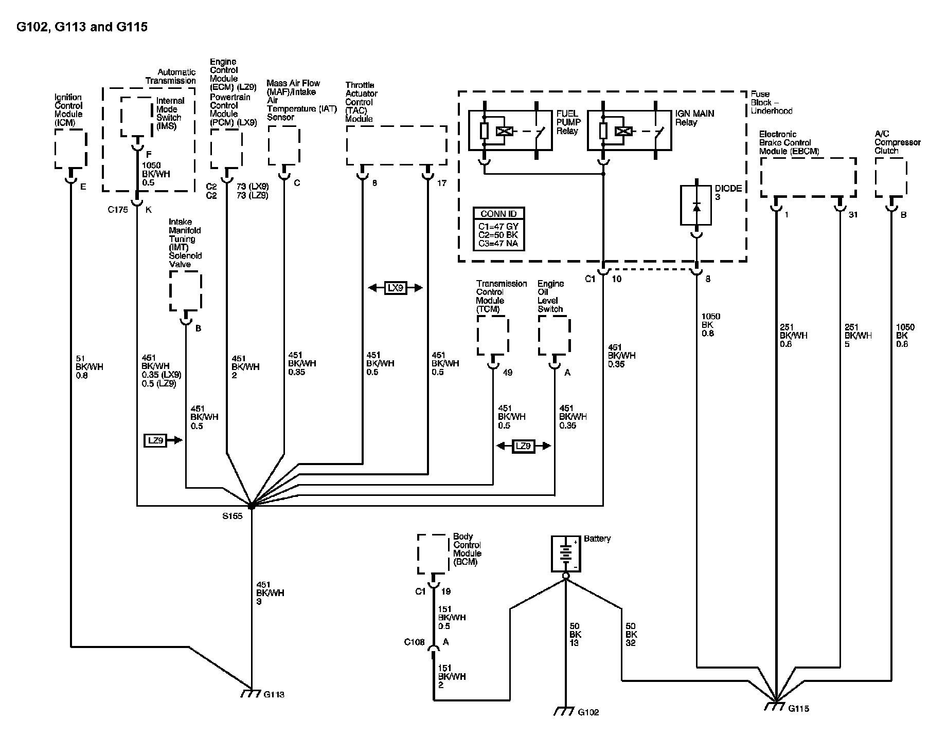 The locations for the Connectors, Grounds, Splices, and Grommets shown within these diagrams can be found via their numbers at Vehicle Locations.