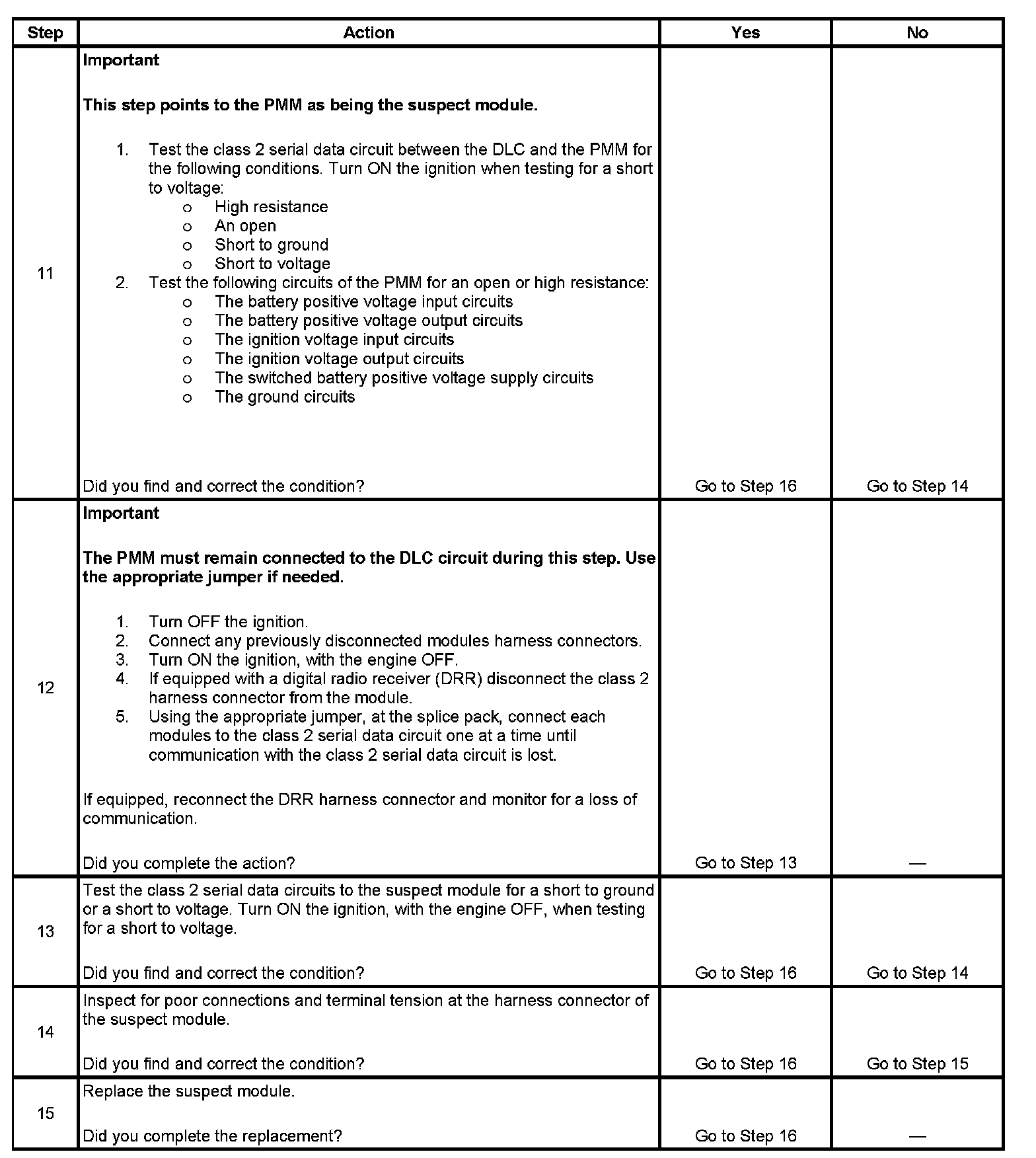 12. This step uses the loss of communications with a class 2 serial data circuit to locate the probable malfunction.On vehicles equipped with a digital radio receiver (DRR), the DRR must be isolated from the sensing and diagnostic module (SDM) to evaluate the condition of that class 2 serial data circuit branch. The following modules communicate on the class 2 serial data circuit: