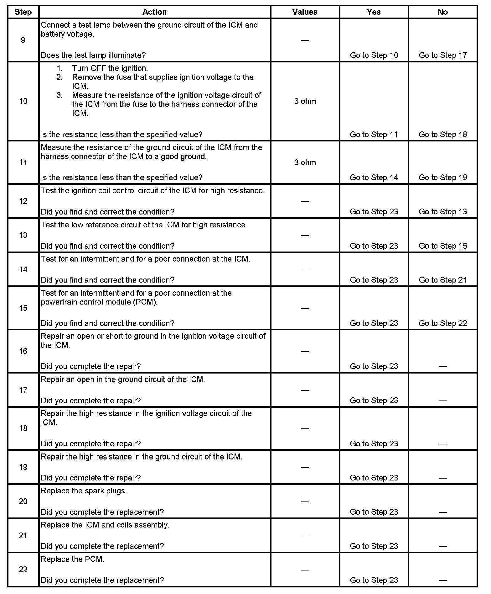 The powertrain control module (PCM) controls each dual-tower ignition coil by transmitting timing pulses on the ignition coil control circuit to the ICM for the proper coil to enable a spark event.