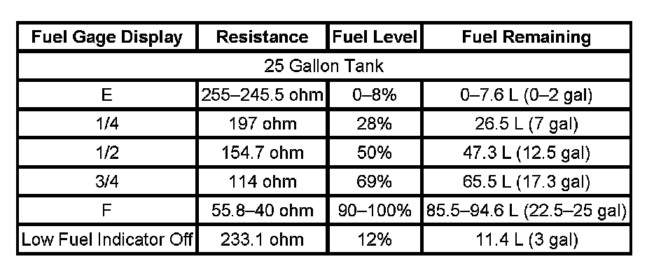 The information in this table is intended for use with the J 33431-C Signal Generator and Instrument Panel Tester. The fuel level sensor values represent the test values to be used on the Signal Generator to drive the fuel gage display to the indicated positions. Vehicles that require more than one fuel level sensor calculate gage position from many possible resistance combinations of fuel levels between the two tanks. Therefore, the values in the table may not correlate directly to readings taken from the vehicle primary or secondary sending units.