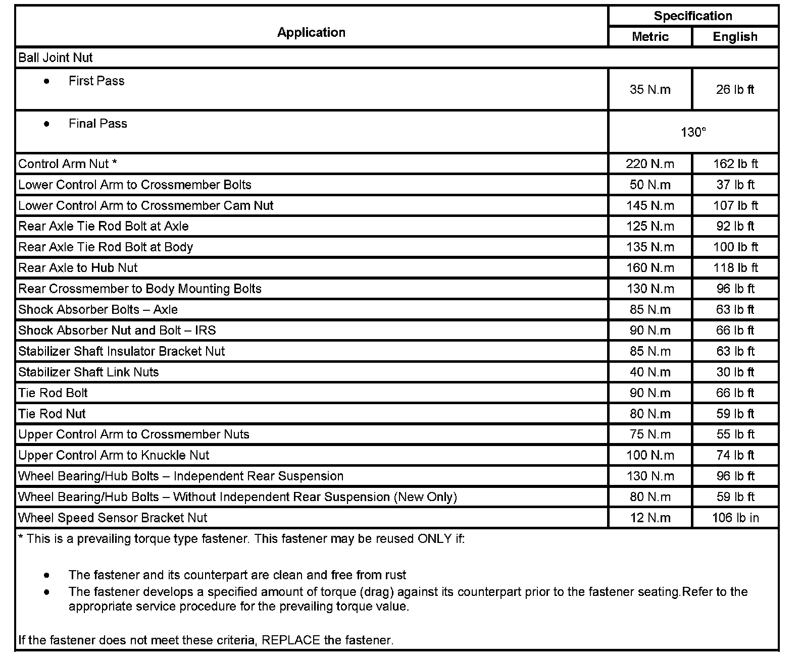 Fastener Tightening Specifications: