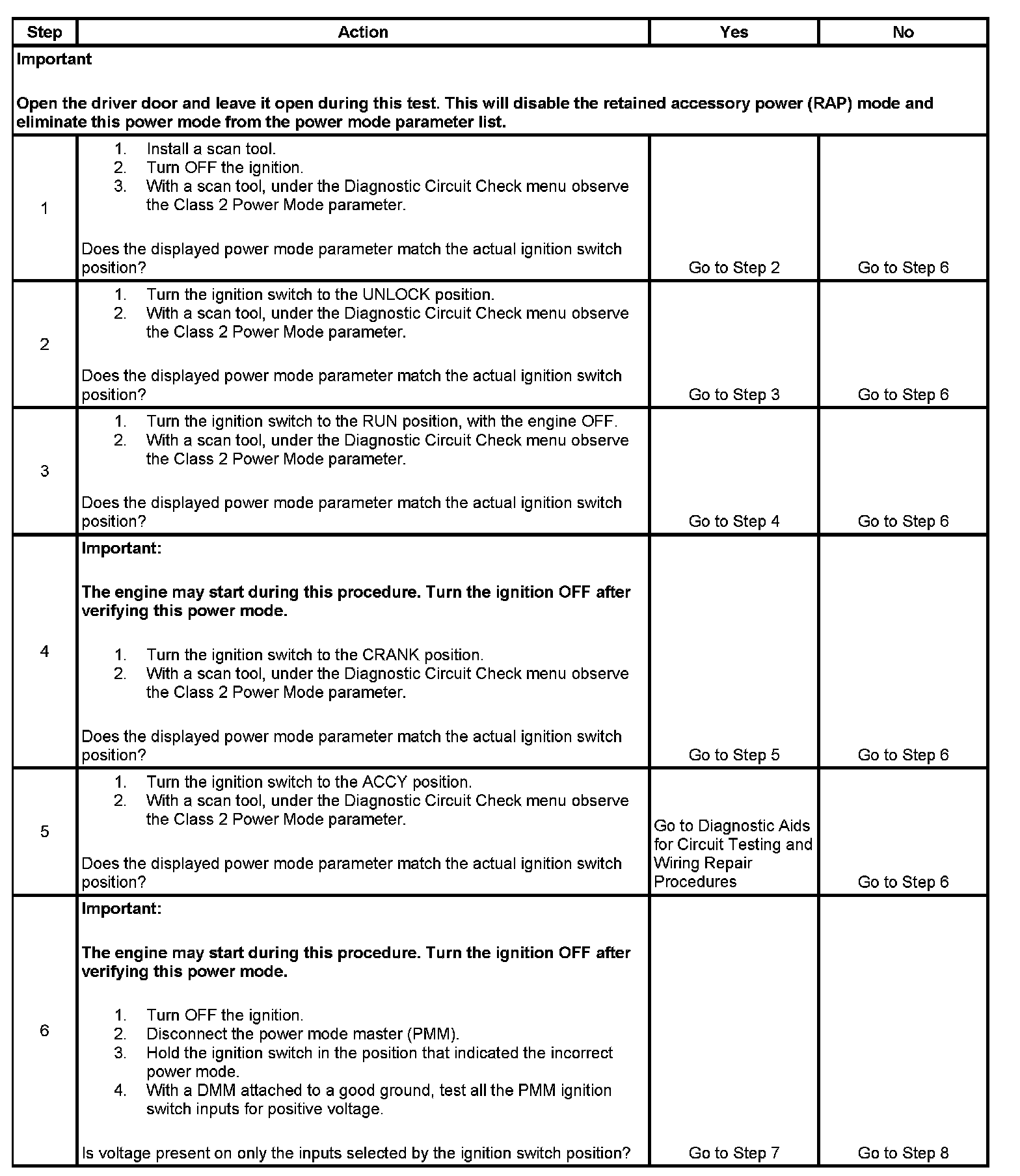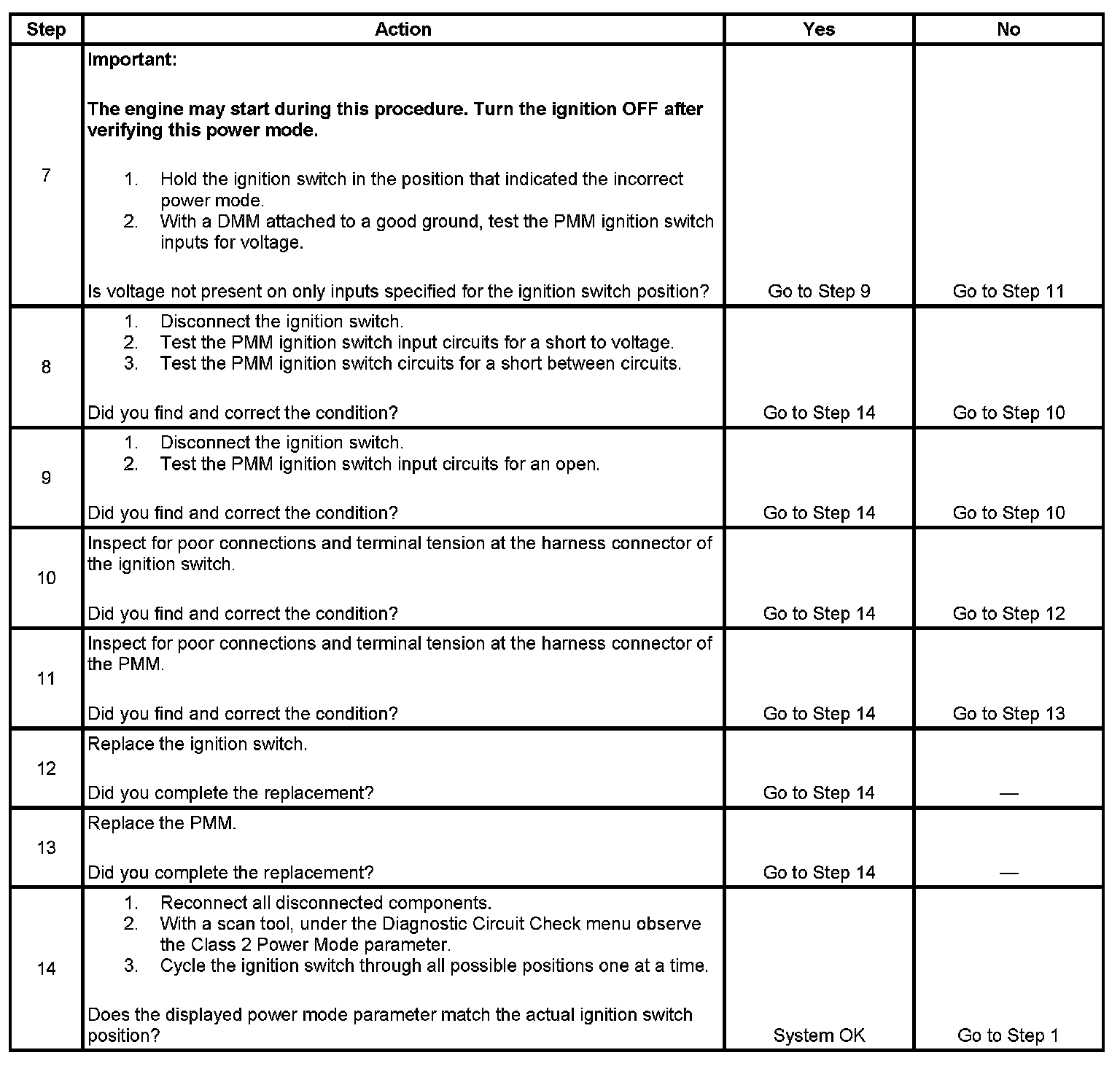 The numbers below refer to the step numbers on the diagnostic table.