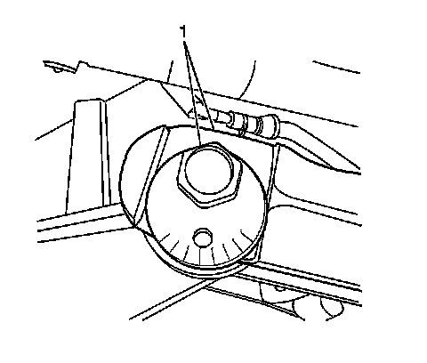 17. Make a mark on the lower control arm at the cam indicator (1).