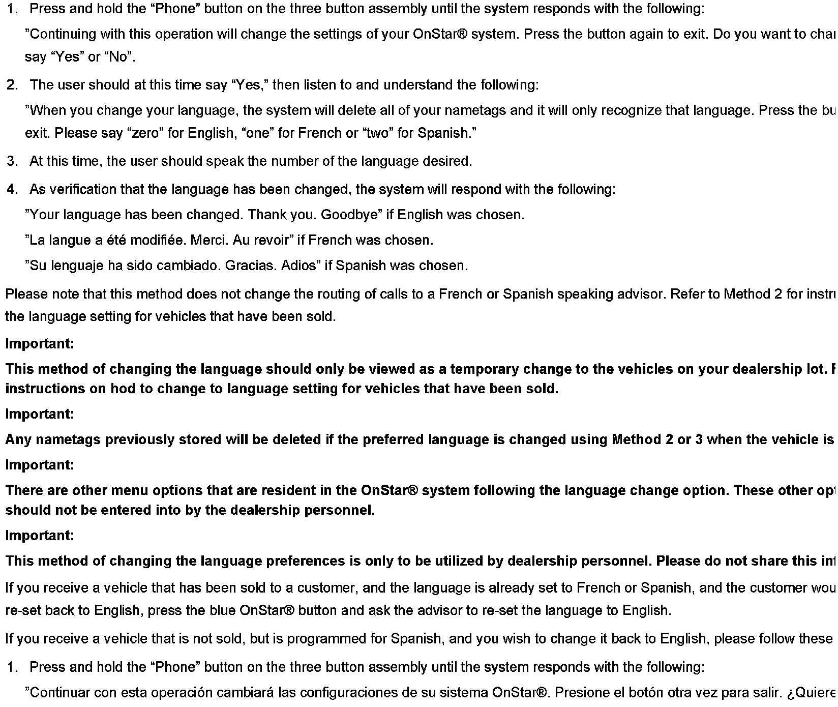This method cannot be used to change the language of the OnStar(R) system for unsold vehicles on your lot. Use this method only for vehicle that have been sold to customers.