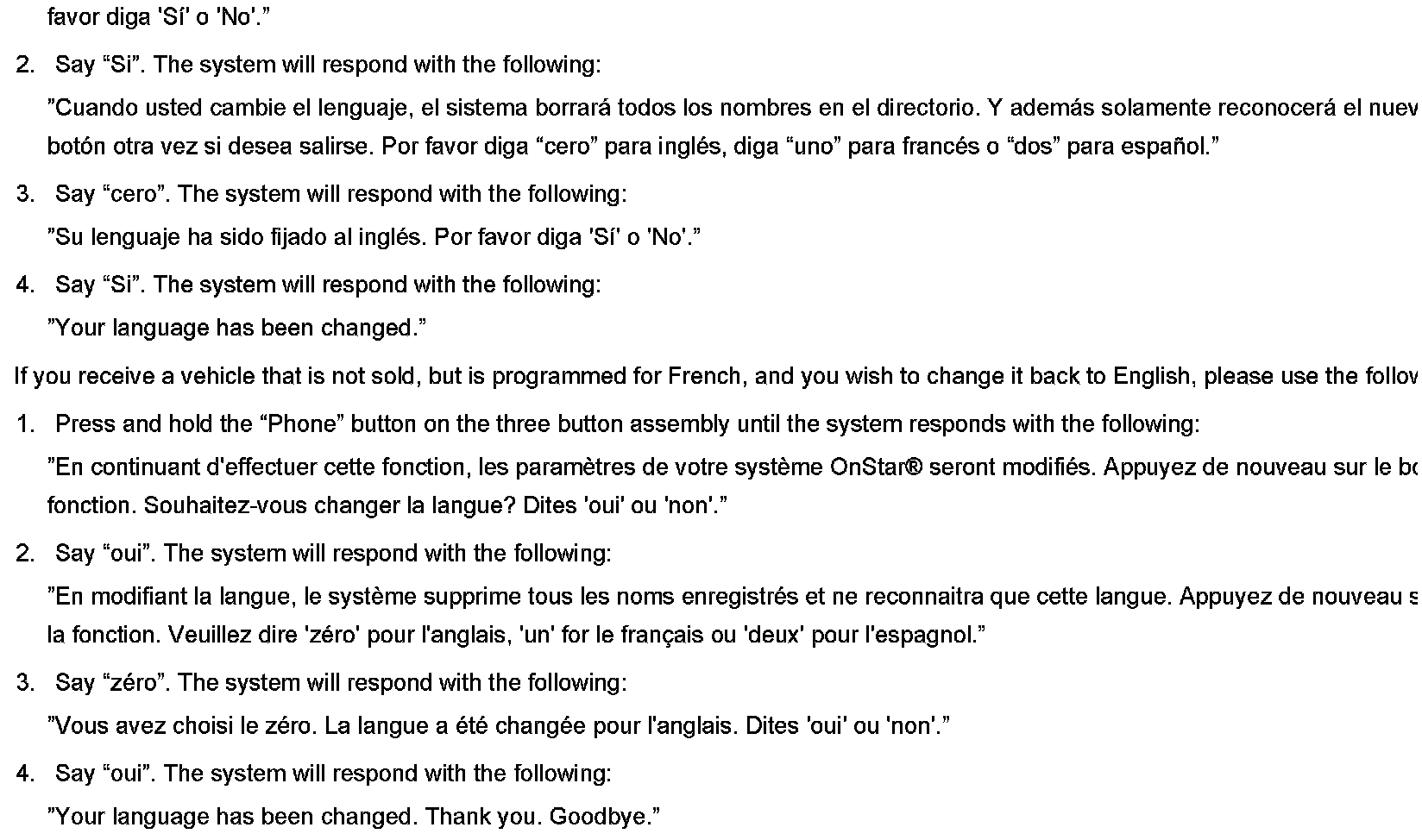 Once completed, this process completely changes all voice recognition and voice commands of the OnStar(R) system. The process will need to be repeated in its entirety to change to a different language, including English.