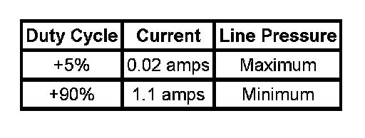 TCC duty cycle for ECCC equipped vehicles is 22 percent for minimum apply pressure and 43 percent for maximum apply pressure. The TCC PWM solenoid valve will typically be 40-60 percent at full apply. Your results may vary.