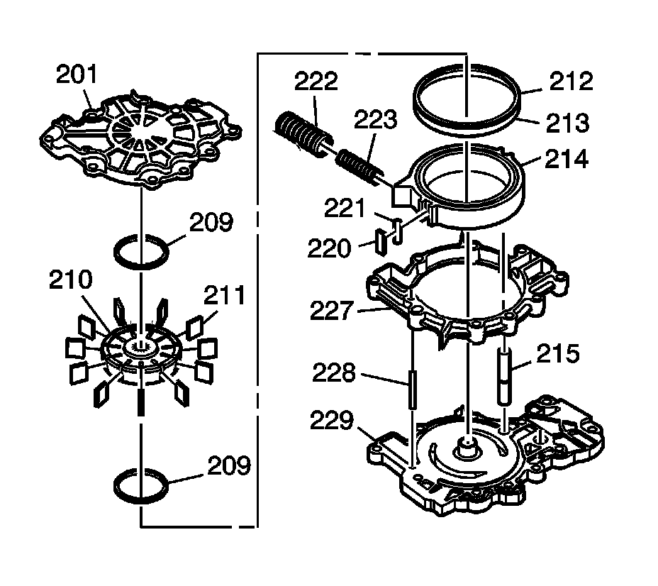 3. Remove the vanes (211), the oil seal ring (212) and the slide O-ring seal (213).