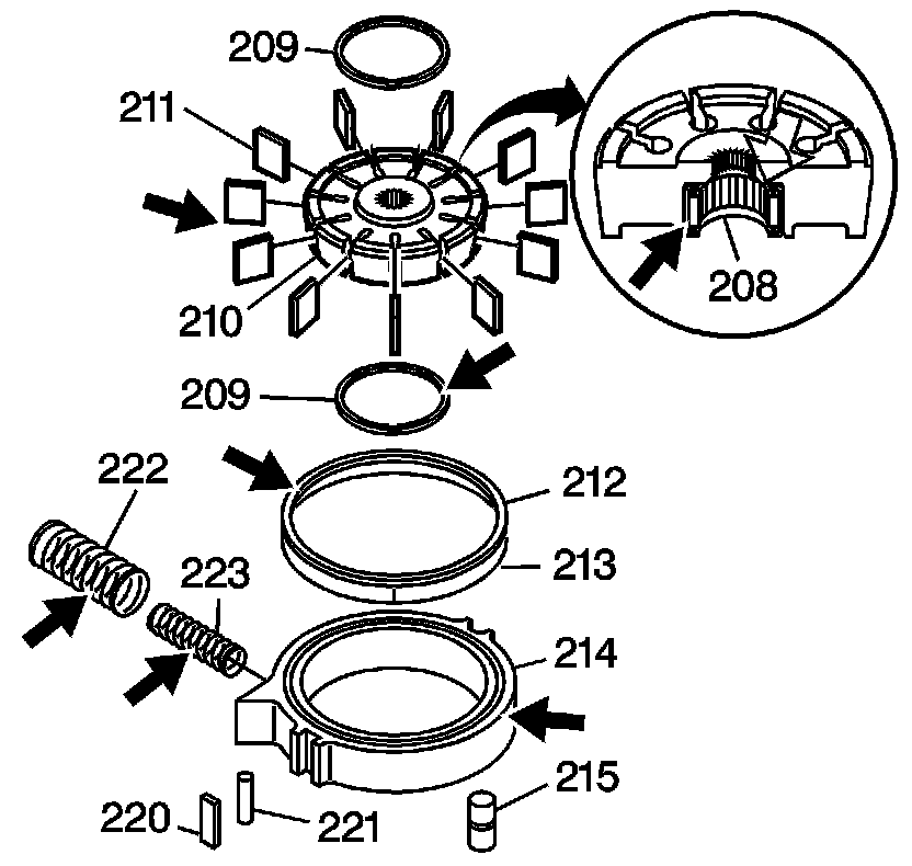 13. Install the pump vanes (211) into the rotor (210). The pump vane must be flush with the top of the rotor.