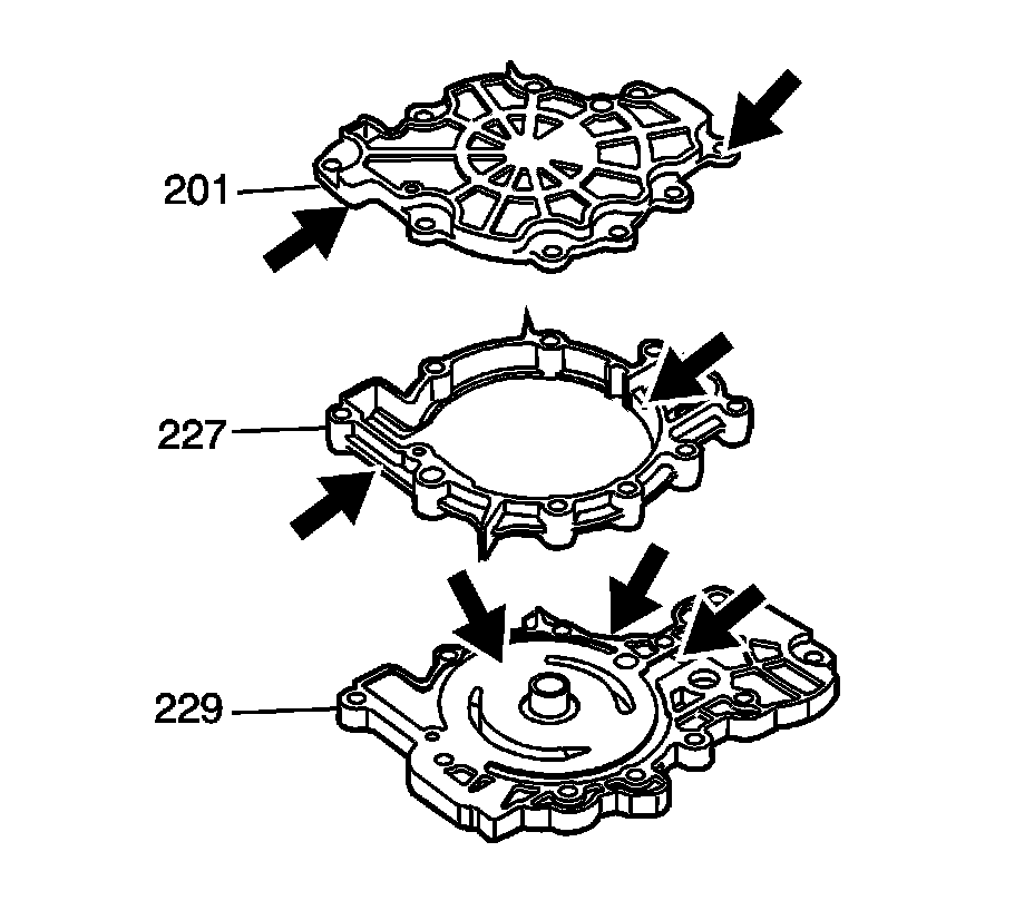 3. Inspect the oil pump cover (201) for cracks, wear or gouges from the pump vanes.