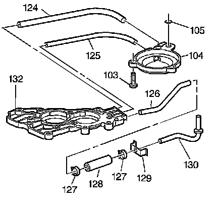 6. Disassemble the lube oil pipe (126), the hose clamps (127), the hose (128), the lube oil pipe retainer (129) and the lube oil pipe and washer assembly (130).