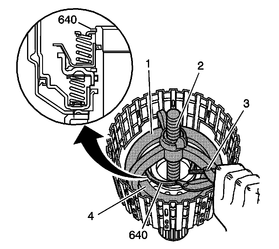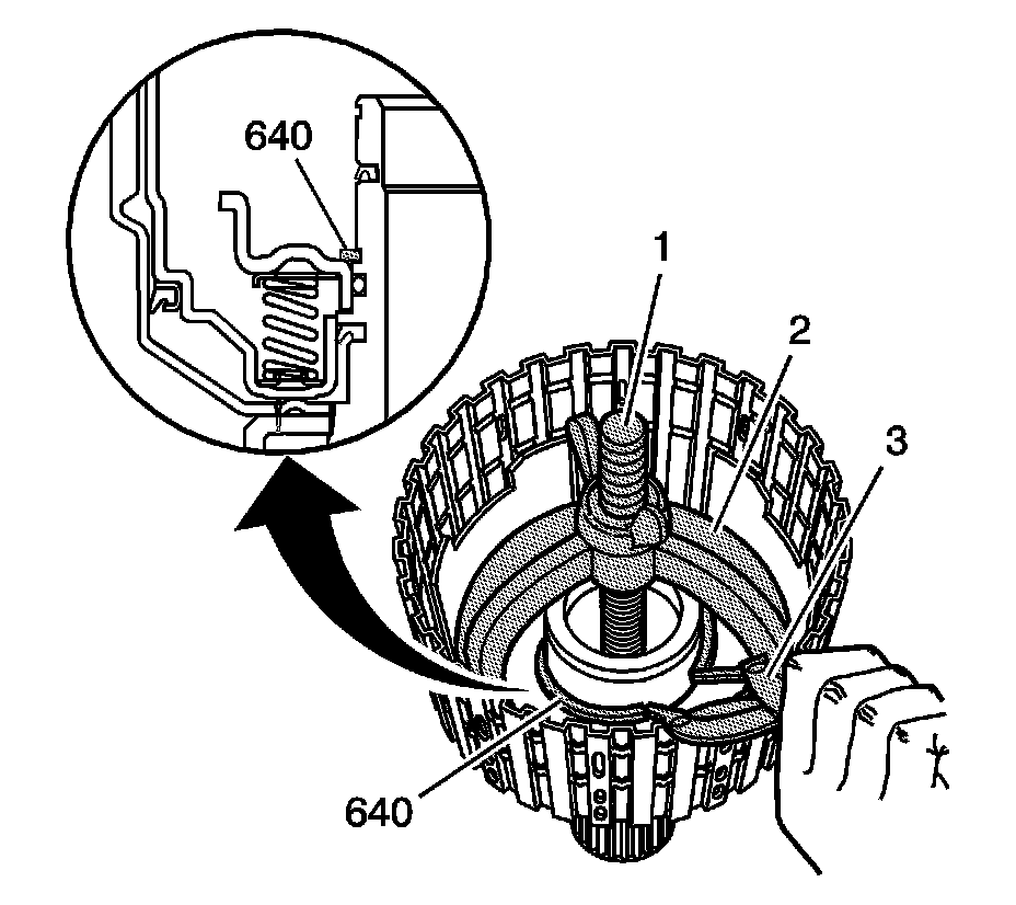 13. Remove the third clutch retainer and guide spring assembly (643).